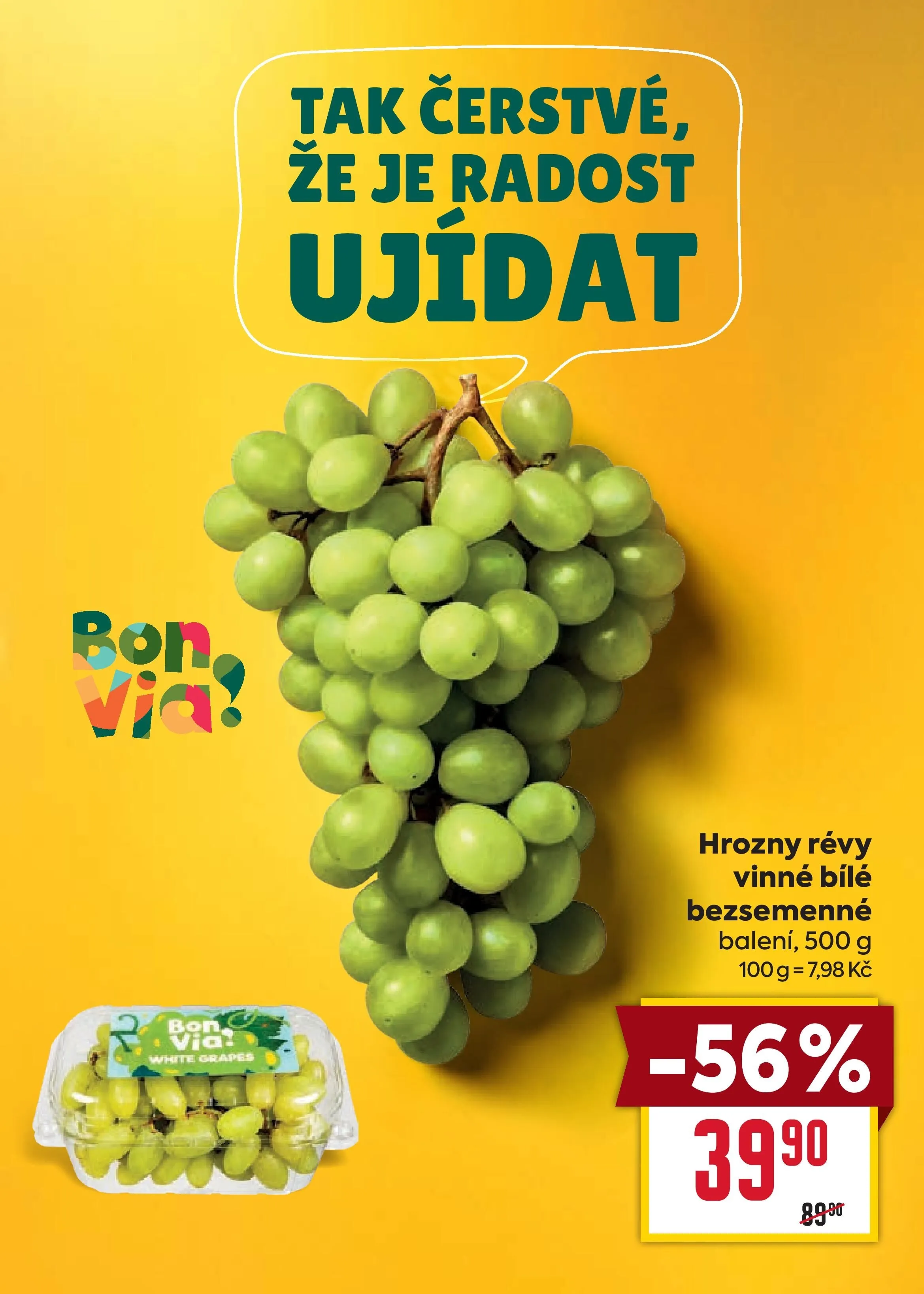 V letáku obchodu BILLA najdete čerstvé hrozny révy vinné bílé bezsemenné v balení 500 g. Tyto lahodné hrozny jsou ideální na mlsání a potěší každého milovníka ovoce. Cena je nyní zvýhodněná, 100 g za 7,98 Kč, a navíc můžete využít slevu 56%. Nezapomeňte si je přidat do nákupního seznamu!