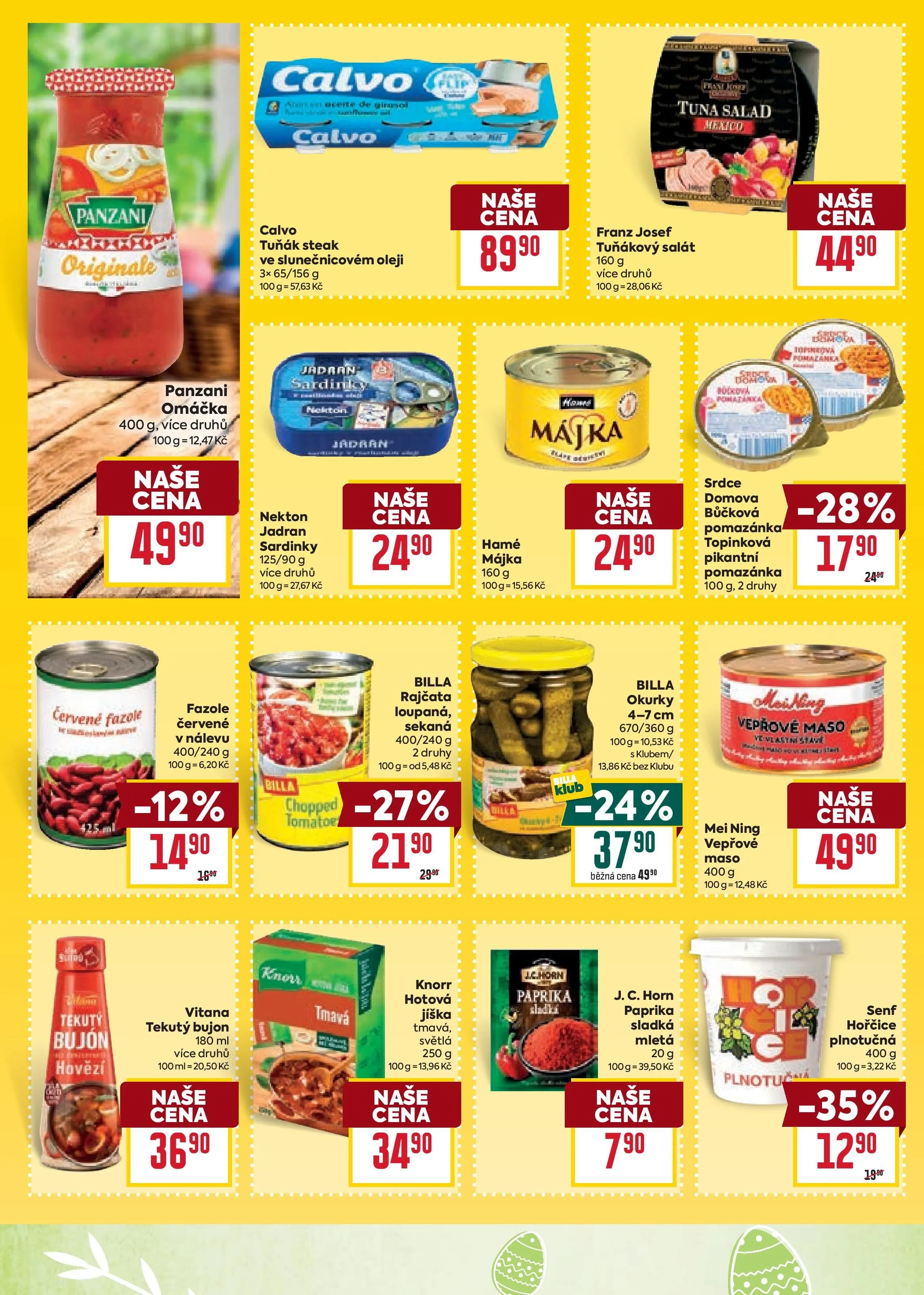 V letáku obchodu BILLA najdete širokou nabídku kvalitních produktů za výhodné ceny. Mezi nimi se objevují tuňákové speciality, jako je tuňák steak ve slunečnicovém oleji a tuňákový salát od značky Franz Josef. Dále si můžete vybrat z omáček Panzani nebo červených fazolí v nálevu.