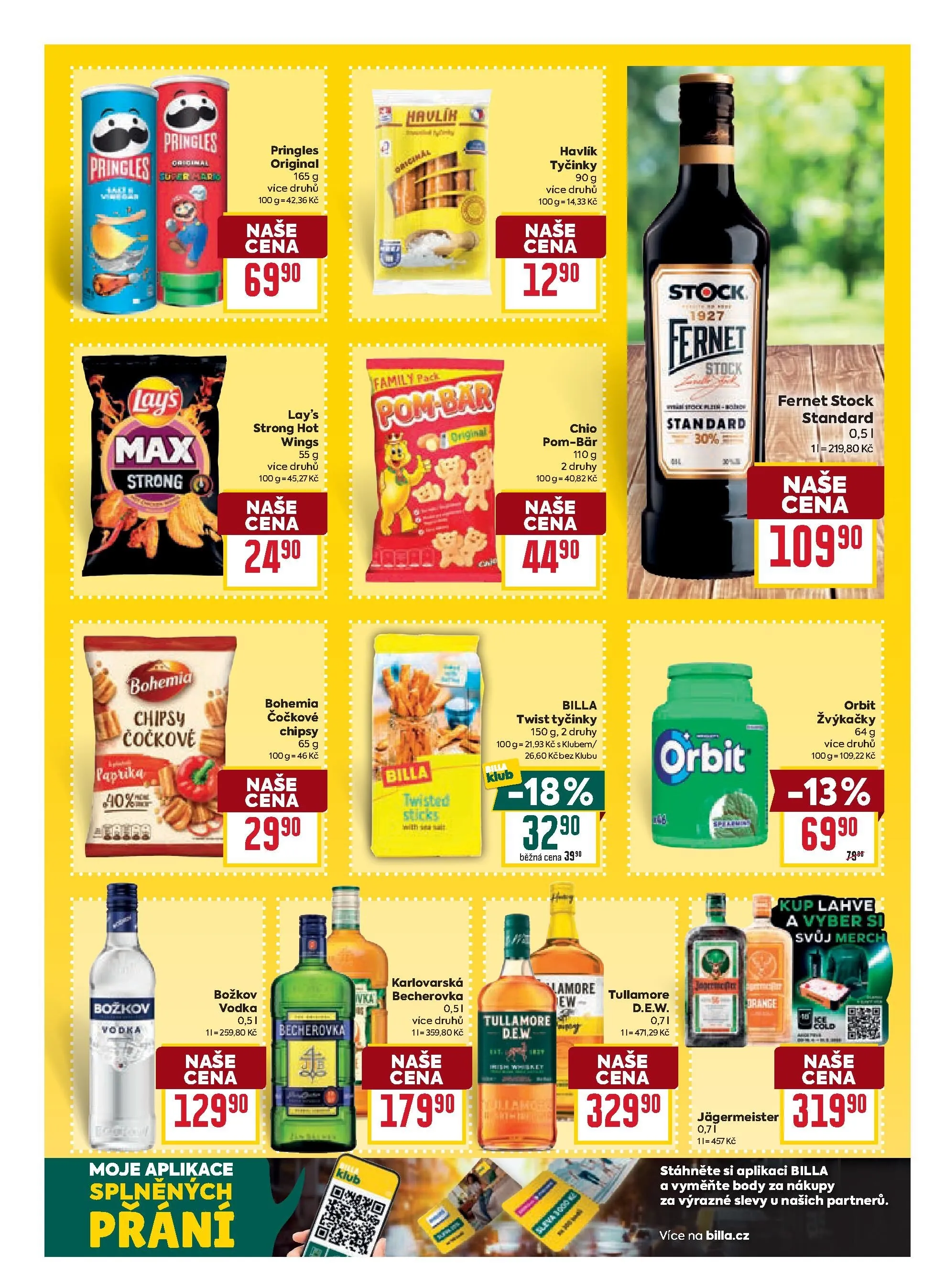 V letáku obchodu BILLA najdete širokou nabídku oblíbených snacků a nápojů. Mezi nimi jsou chipsy Pringles v různých příchutích, které si můžete pořídit za cenu 100 g = 42,36 Kč. Dále nabízíme Lay's Strong Hot Wings a čočkové chipsy Bohemia, které jsou také v akci.
