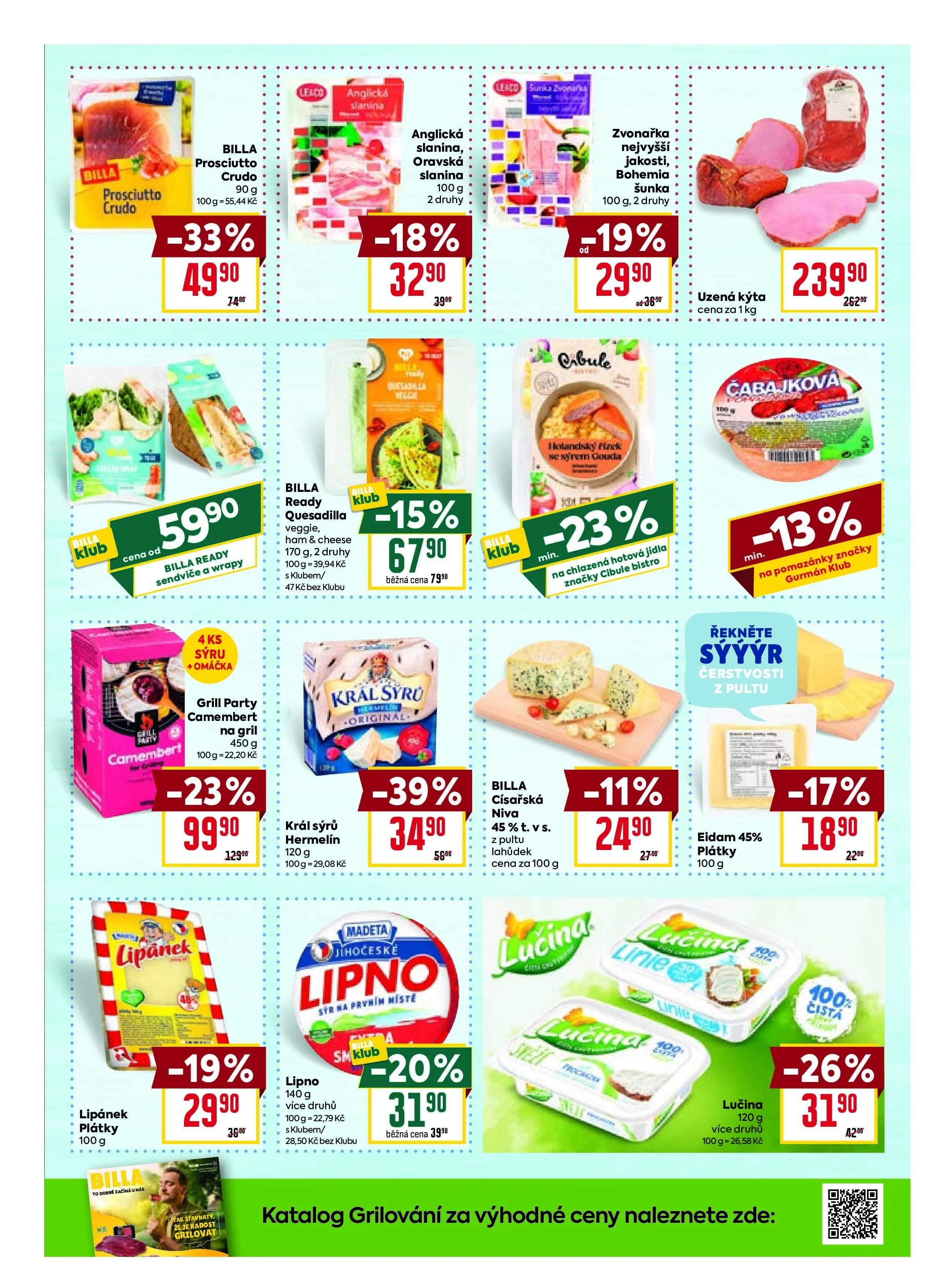 V letáku obchodu BILLA najdete skvělé nabídky na produkty ideální pro grilovací párty. Nabízíme plátky sýru s výraznou slevou -33% za 49,90 Kč. Dále si můžete vybrat slaninu, která je nyní za 29,90 Kč, což představuje slevu 19%. Nezapomeňte také na krále sýrů, který je k dostání za 32,90 Kč. Pro milovníky eidamu máme plátky za 18,90 Kč, což je sleva 26%. Prozkoumejte náš katalog grilování a využijte výhodné ceny!