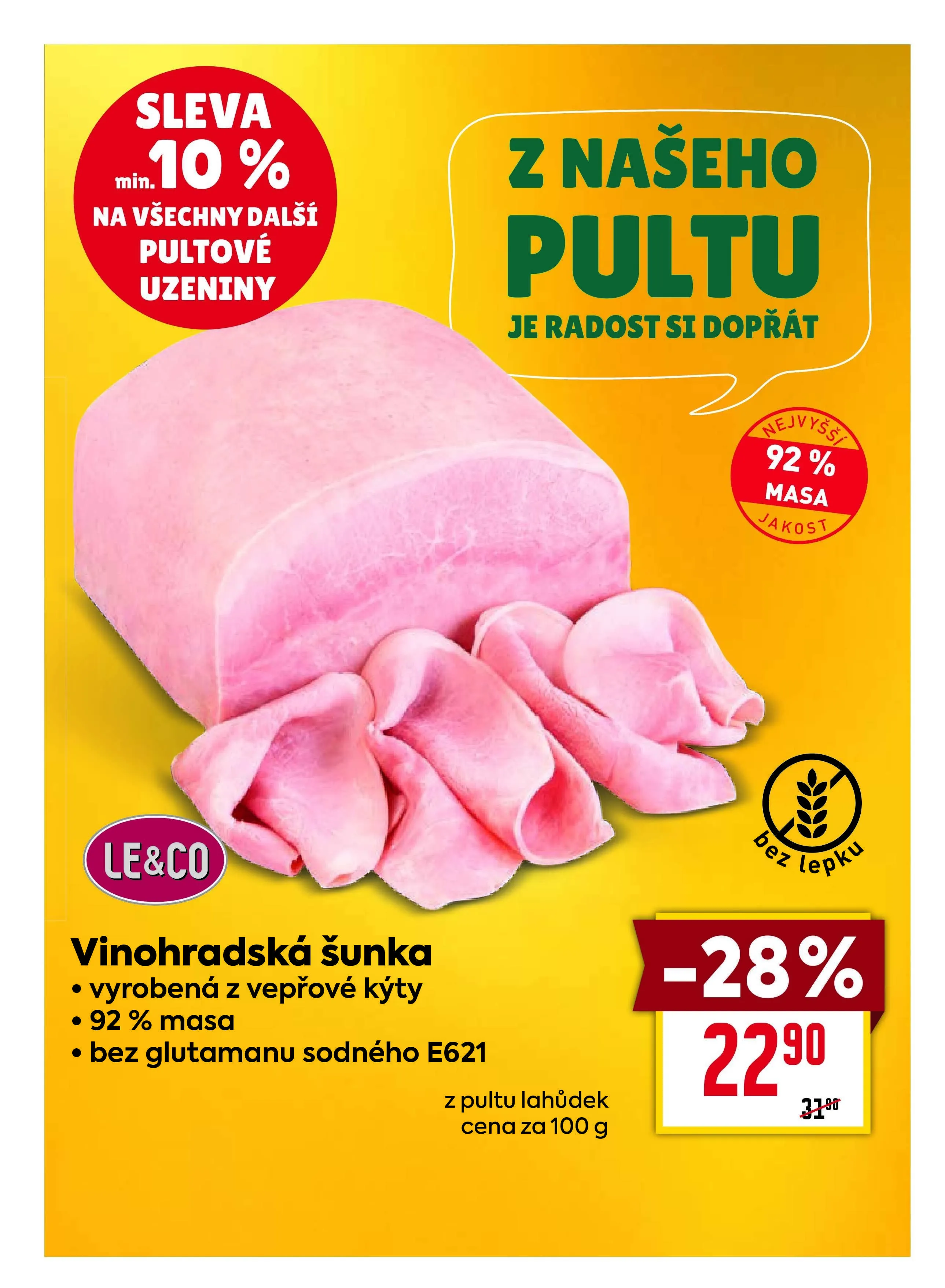 V letáku obchodu BILLA najdete skvělé slevy na všechny pultové uzeniny. Mezi nimi vyniká Vinohradská šunka, vyrobená z kvalitní vepřové kýty s obsahem 92 % masa. Je radost si dopřát takové lahůdky, které neobsahují glutaman sodný e621. Cena za 100 g je nyní výhodná, takže neváhejte a dopřejte si tuto delikatesu z našeho pultu! -28% sleva na všechny další pultové uzeniny!
