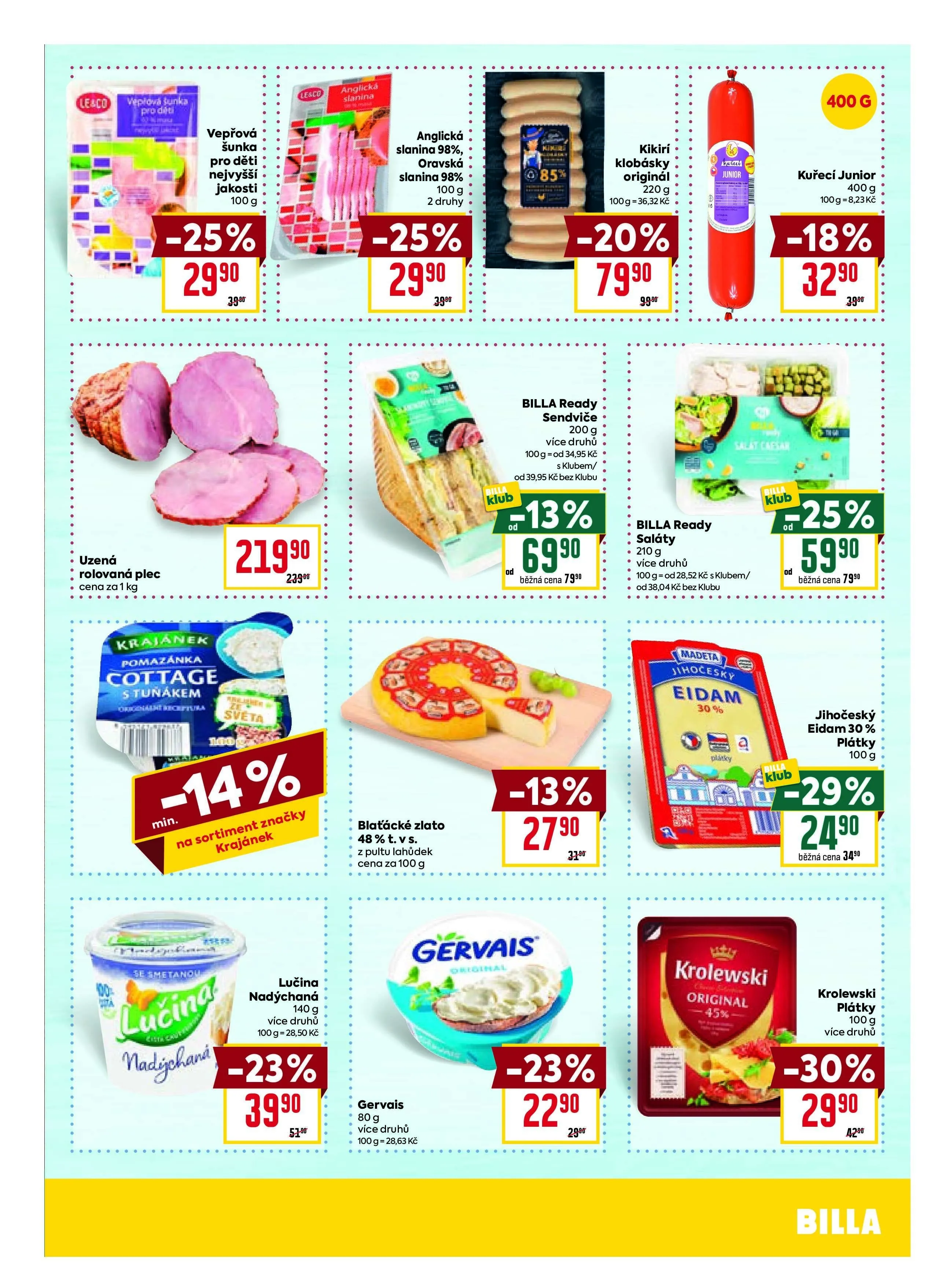 V letáku obchodu BILLA najdete širokou nabídku produktů za skvělé ceny. Například klobásky Oravské jsou nyní se slevou 25% za 29,90 Kč. Dále nabízíme saláty BILLA Ready, které jsou k dostání za 27,90 Kč. Nezapomeňte také na eidam Krolewski, který je nyní za 22,90 Kč. Kuřecí maso je k dispozici za 24,90 Kč s 18% slevou. Využijte těchto výhodných nabídek a nakupujte chytře!