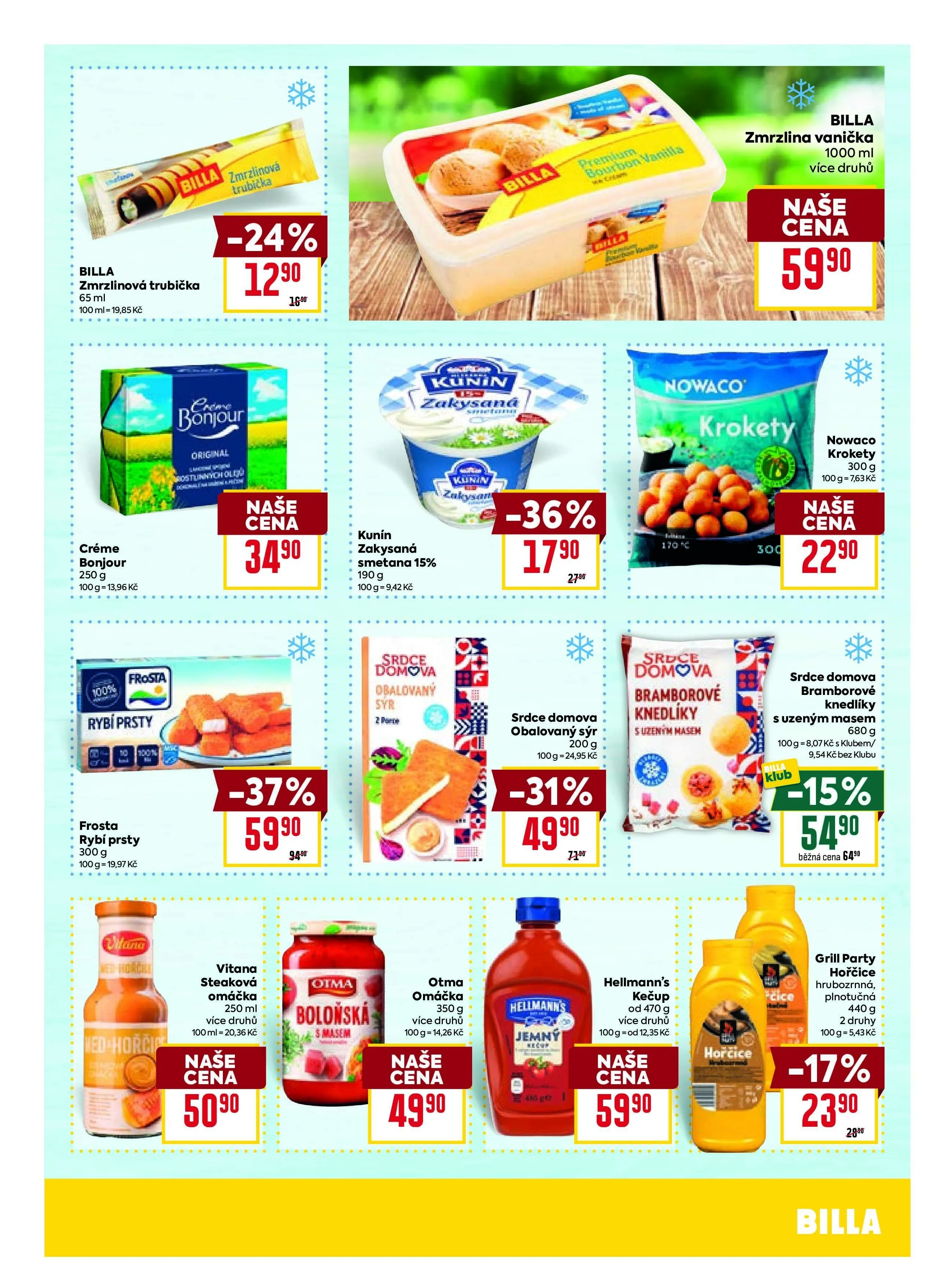 V letáku obchodu BILLA najdete širokou nabídku produktů za skvělé ceny. Mezi nimi jsou rybí prsty za 129 Kč, zmrzlina v vaničce o objemu 1000 ml za 349 Kč a smetana 15% za 179 Kč. Nezapomeňte také na bramborové knedlíky za 200 Kč a boloňskou omáčku za 499 Kč. Pro milovníky grilování máme grill pánev za 239 Kč a s uzeným masem za 599 Kč. Využijte skvělé akce a ušetřete!