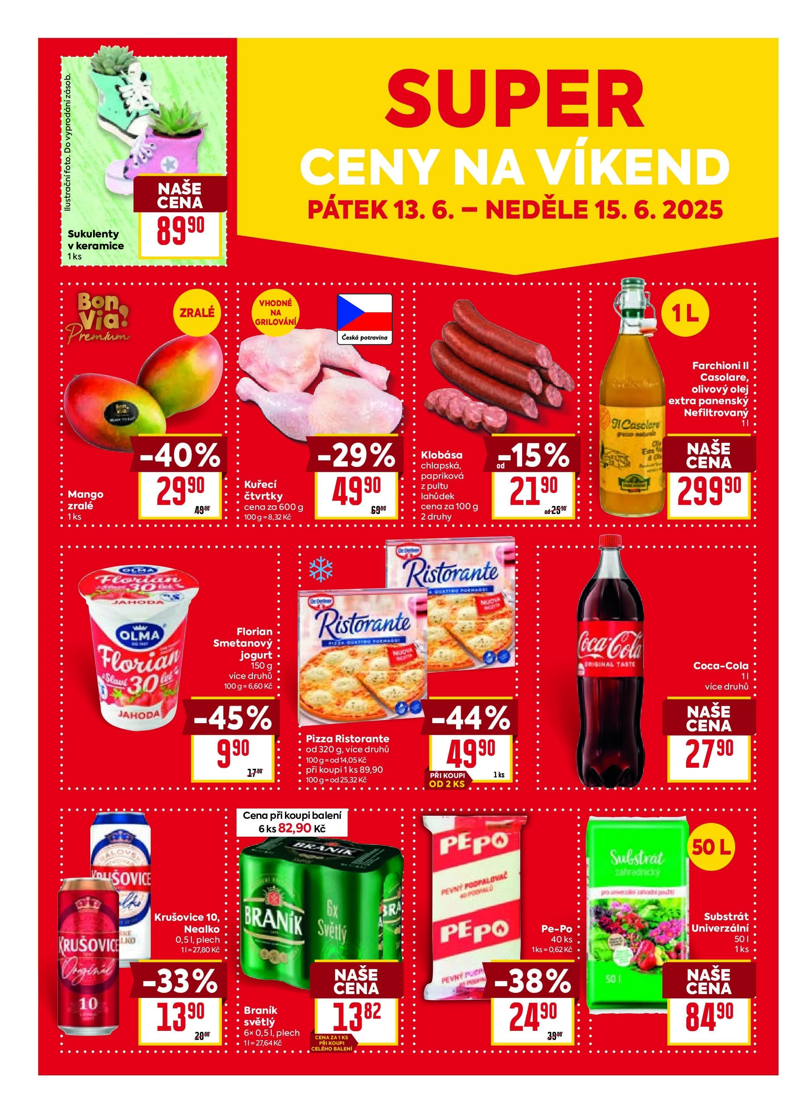 V letáku obchodu BILLA na víkend od pátku 13.6. do neděle 15.6.2025 najdete skvělé akční nabídky. Zralé mango za 49,90 Kč, kuřecí čtvrtky se slevou 29% za 21,90 Kč a klobásu s 15% slevou za 21,90 Kč. Nezapomeňte také na smetanový jogurt Olma, který je nyní za 9,90 Kč, což je sleva 40%.