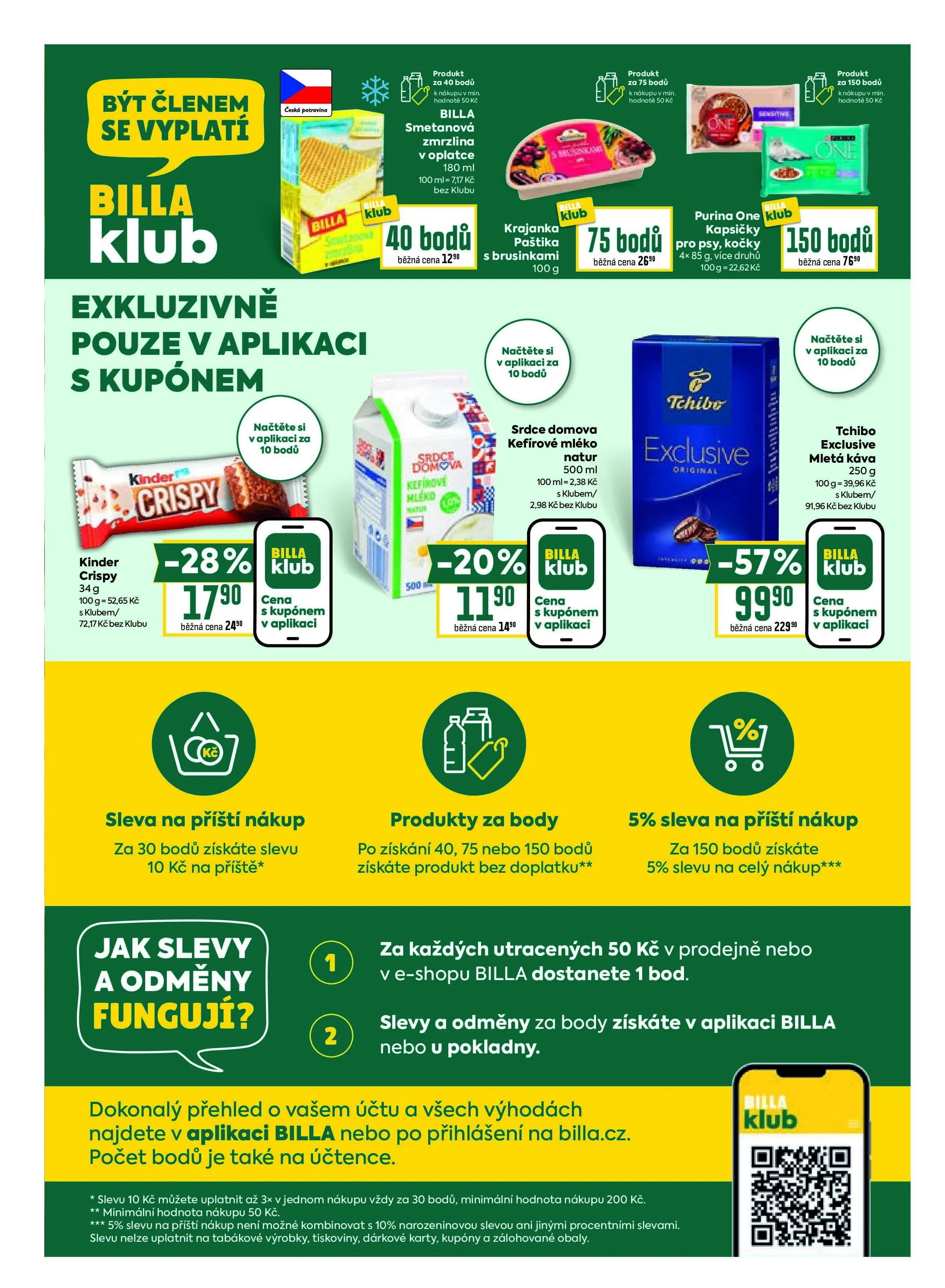 V letáku obchodu BILLA najdete skvělé nabídky pro členy BILLA klubu. Exkluzivně v aplikaci můžete využít kupóny na různé produkty, jako je paštika s brusinkami nebo kapsičky pro psy a kočky. Získávejte body za každý nákup – za 30 bodů získáte slevu 10 Kč na příští nákup a po nasbírání 40, 75 nebo 150 bodů můžete získat produkty bez doplatku. Nezapomeňte, že za každých utracených 50 Kč dostanete 1 bod. Sledujte svůj účet a výhody v aplikaci BILLA nebo na billa.cz. Počet bodů najdete také na účtence. Připojte se k BILLA klubu a využijte všechny výhody!