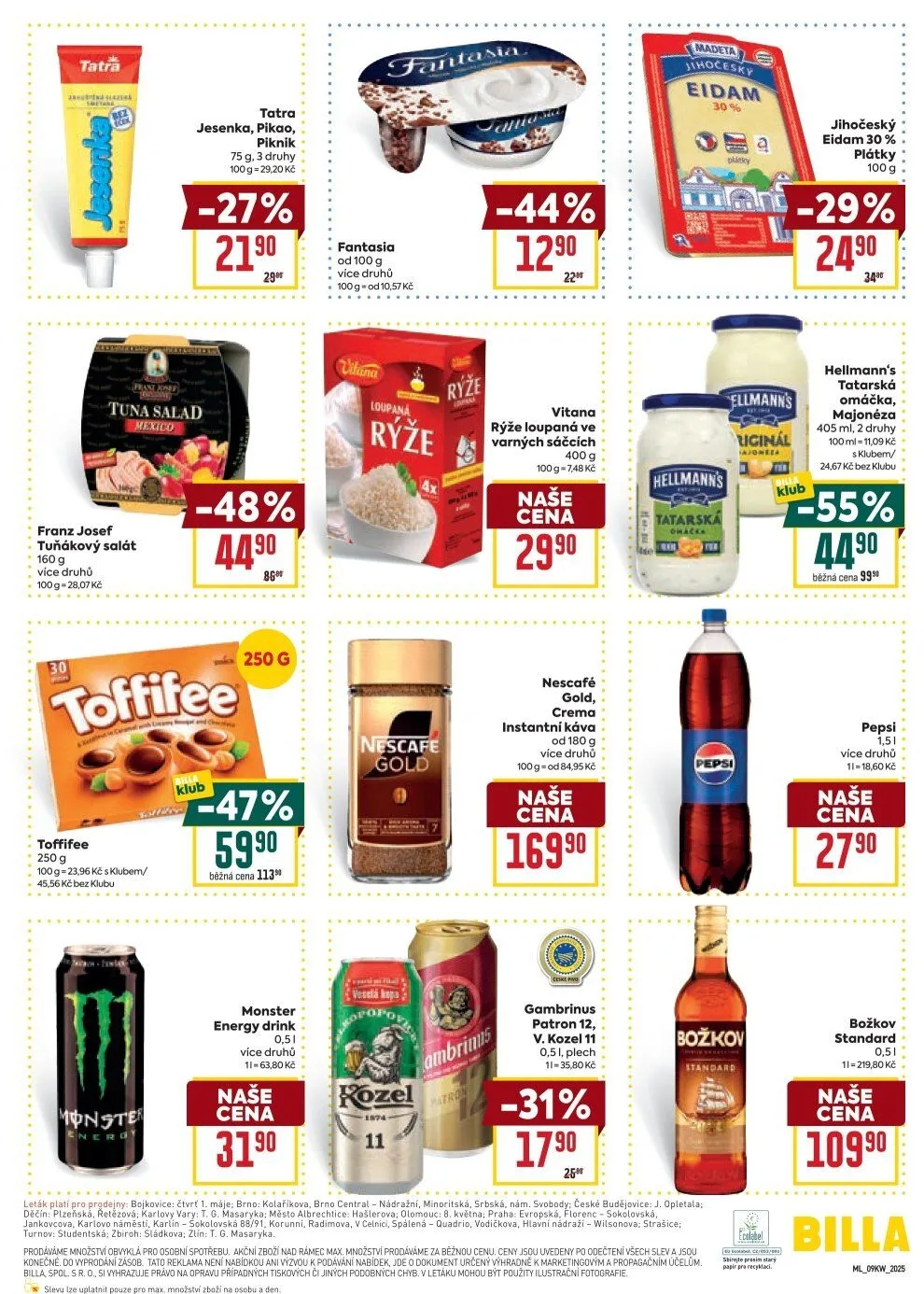 V letáku obchodu BILLA najdete širokou nabídku produktů za skvělé ceny. Mezi nimi je tuňákový salát značky Franz Josef v 160 g balení, který je k dispozici v několika variantách. Dále si můžete vybrat z různých druhů tatra, jesenka, pikao a piknik v 75 g balení.