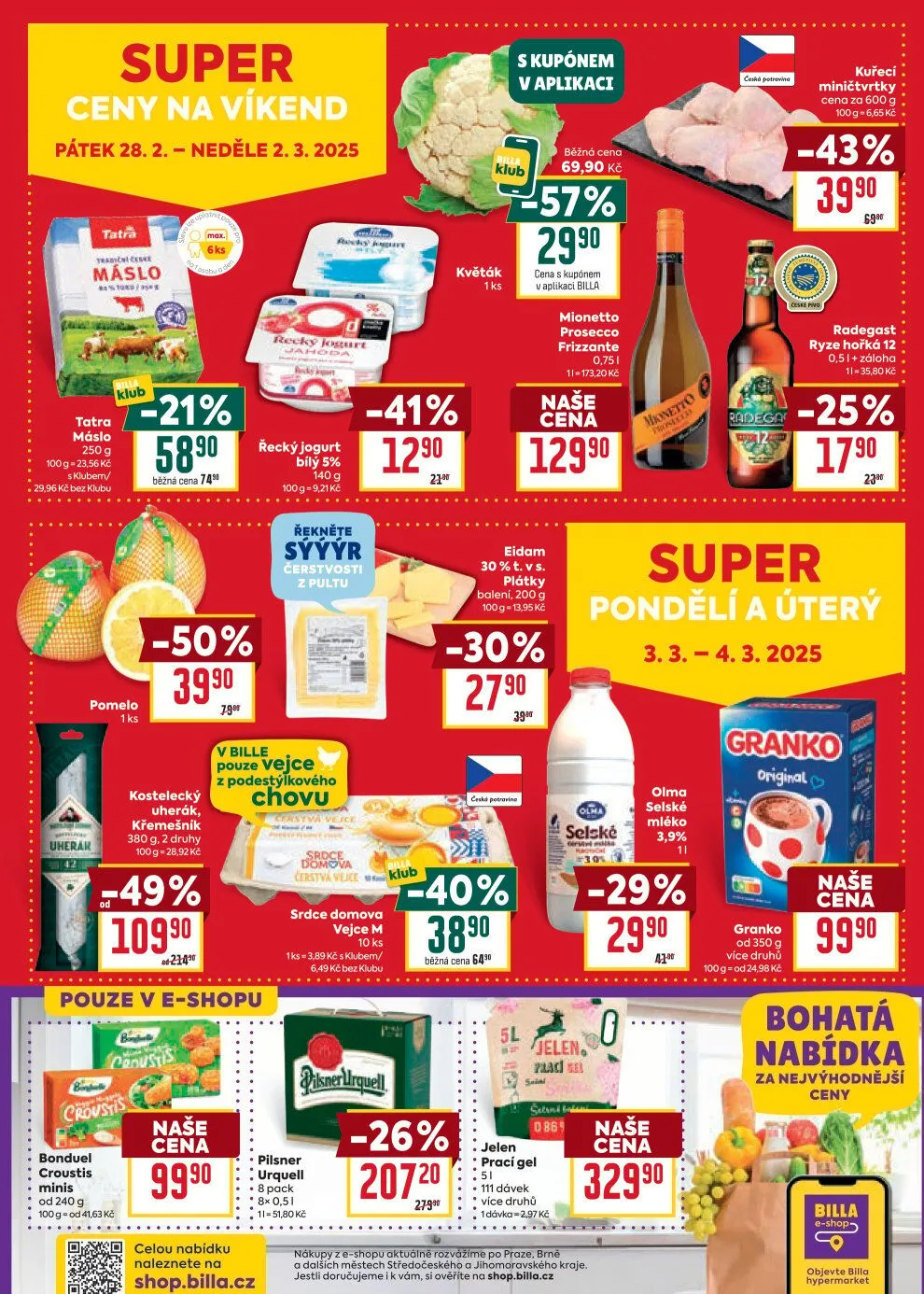 V letáku obchodu BILLA najdete širokou nabídku produktů za super ceny na víkend od pátku 28.2. do neděle 2.3.2025. Mezi akčními položkami se objevuje máslo Tatra 250 g za 29,96 Kč bez klubu, květák se slevou 41% a řecký jogurt bílý 5% 140 g za 69,90 Kč s kupónem v aplikaci.