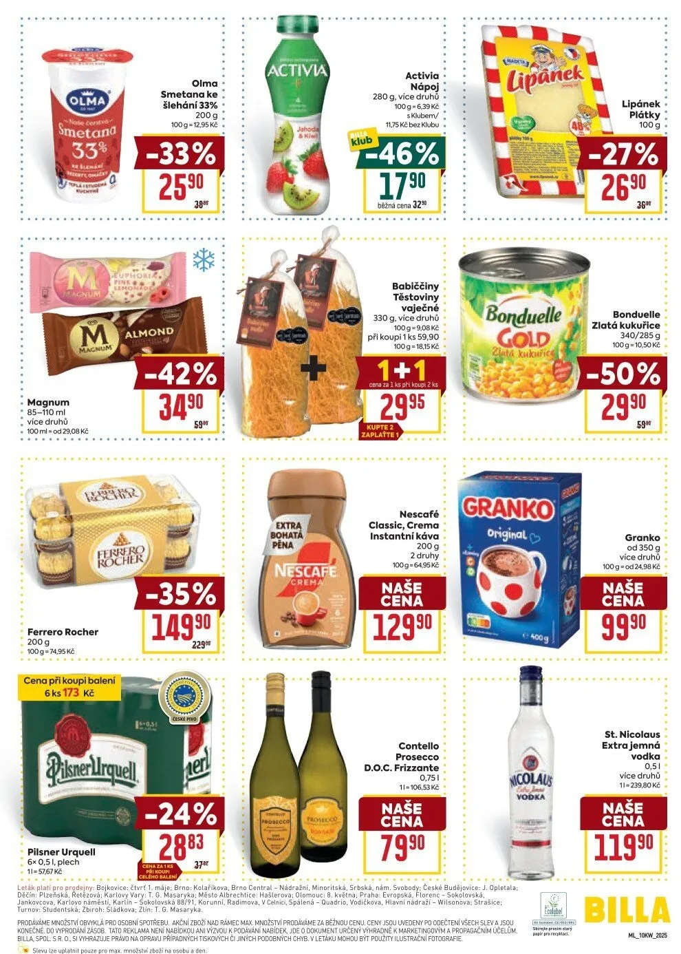 V letáku obchodu BILLA najdete širokou nabídku produktů za výhodné ceny. Mezi nimi se objevují oblíbené jogurty Activia a smetana Olma, ideální pro přípravu různých pokrmů. Pro milovníky kávy je tu Nescafé v několika variantách. Nezapomeňte také na lahodné těstoviny Babiččiny a zlatou kukuřici Bonduelle, které jsou skvělým doplňkem k vašim jídlům. Pro osvěžení doporučujeme prosecco Contello a pro večerní pohodu si můžete dopřát vodku St. Nicolaus. V letáku najdete také akční nabídky, jako je možnost koupit dva kusy a zaplatit jen za jeden. Navštivte BILLA a využijte skvělé slevy!