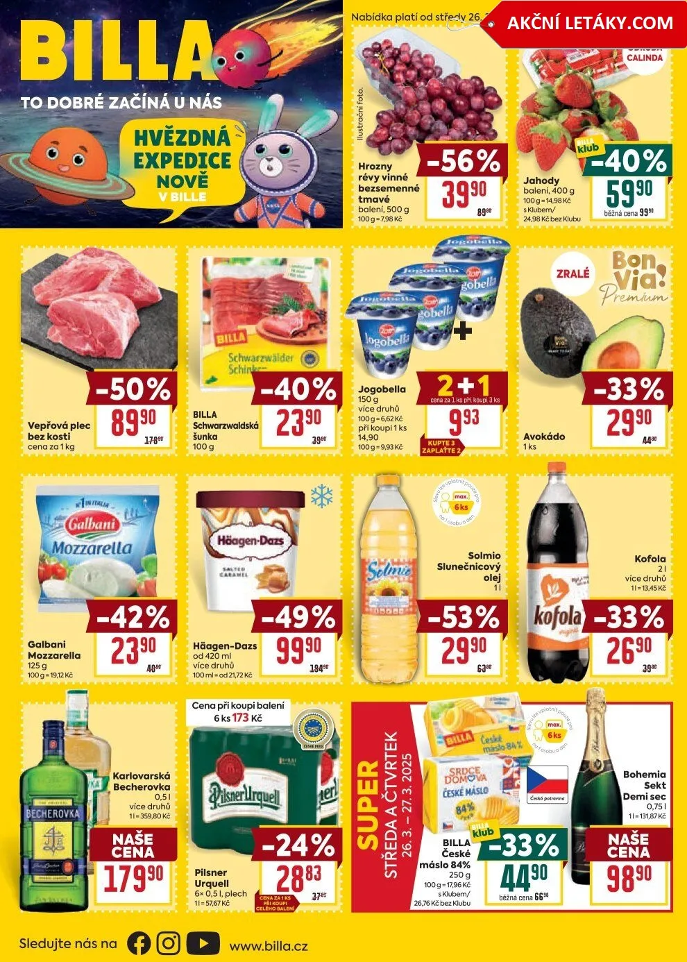 V letáku obchodu BILLA najdete skvělou nabídku produktů, která platí od středy 26.3. do úterý 1.4.2025. Mezi lákavými položkami se objevuje vepřová plec bez kosti za 89,90 Kč/kg, hrozny révy vinné bezsemenné v balení 500 g za 39,90 Kč, a zralé avokádo za 14,90 Kč za kus.
