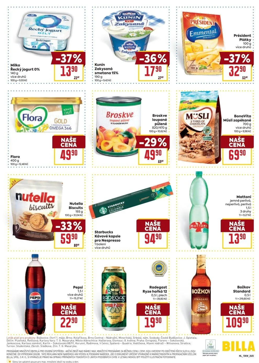 V letáku obchodu BILLA najdete širokou nabídku produktů za skvělé ceny. Mezi nimi je řecký jogurt Milko 0% (140 g) za 29,90 Kč a zakysaná smetana Kunín 15% (190 g) za 9,42 Kč. Nezapomeňte také na Nutellu a Nutella biscuits (193 g) za 49,90 Kč, které jsou nyní se slevou 33%.