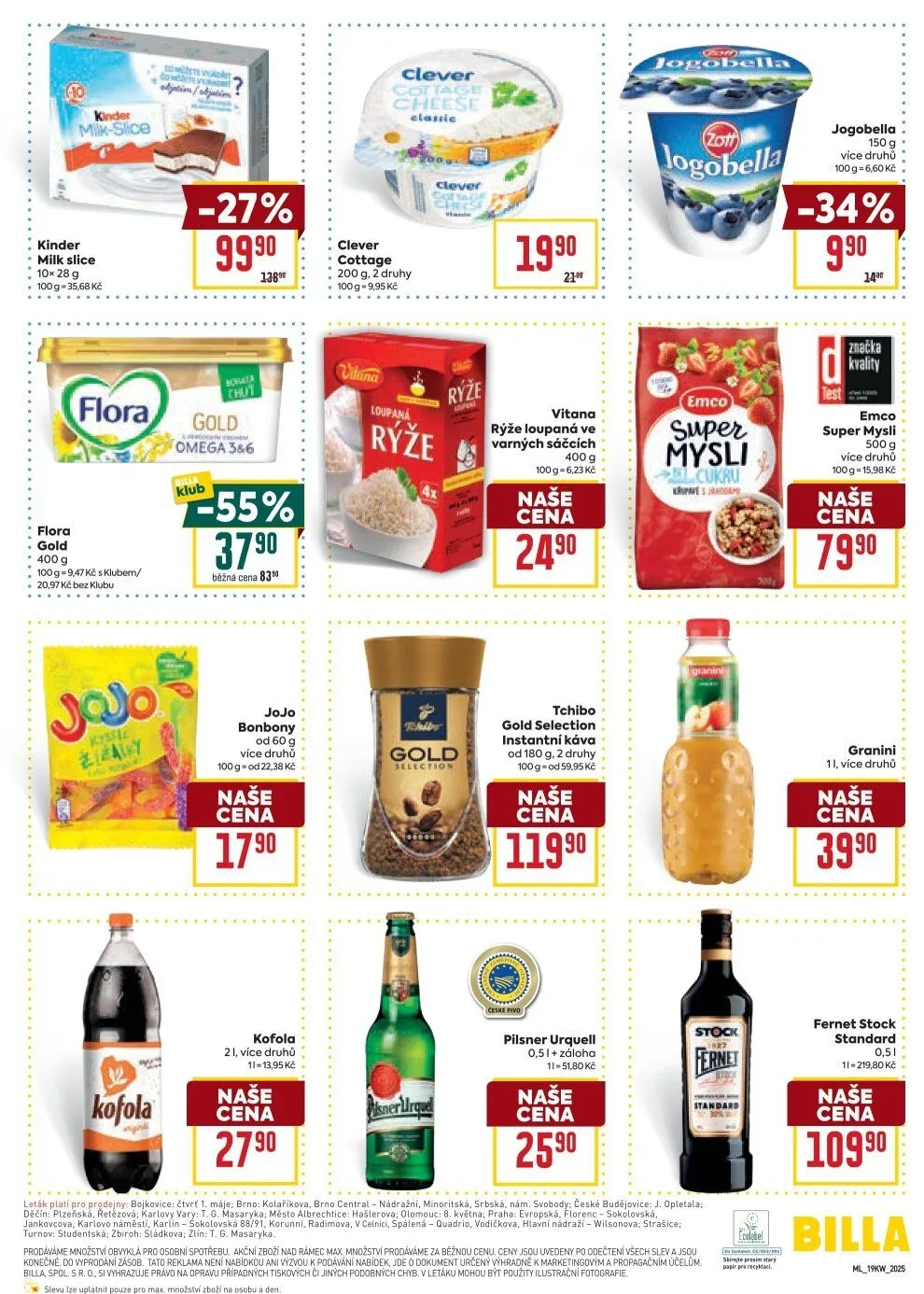 V letáku obchodu BILLA najdete širokou nabídku produktů za skvělé ceny. Mezi nimi jsou například Kinder mléčné plátky (10x28g) za 35,68 Kč/100g. Flora Gold (400g) je k dispozici za 24,97 Kč/100g, přičemž bez klubu je cena 20,97 Kč.