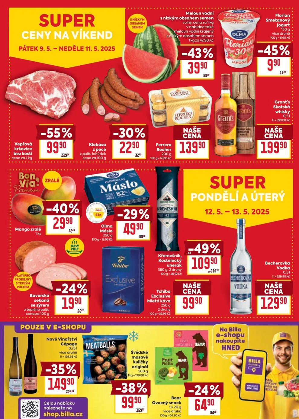 V letáku obchodu BILLA na víkend od pátku 9.5. do neděle 11.5. 2025 najdete skvělé nabídky za výhodné ceny.