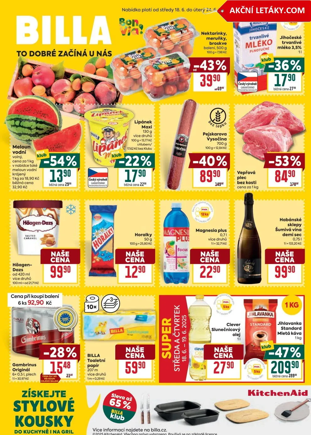 V letáku obchodu BILLA od 18.6. do 24.6.2025 najdete širokou nabídku čerstvého ovoce, jako jsou nektarinky, meruňky a broskve, balení po 500 g za skvělou cenu. Dále si můžete vybrat z trvanlivého jihočeského mléka a melounu vodního, který je k dispozici i v krájené formě. Nezapomeňte také na oblíbené produkty jako toaletní papír BILLA a mletou kávu Jihlavanka. V nabídce jsou i šumivá vína od Habánských sklepů a slunečnicový olej Clever. Využijte slevy a objevte kvalitní výrobky za výhodné ceny!