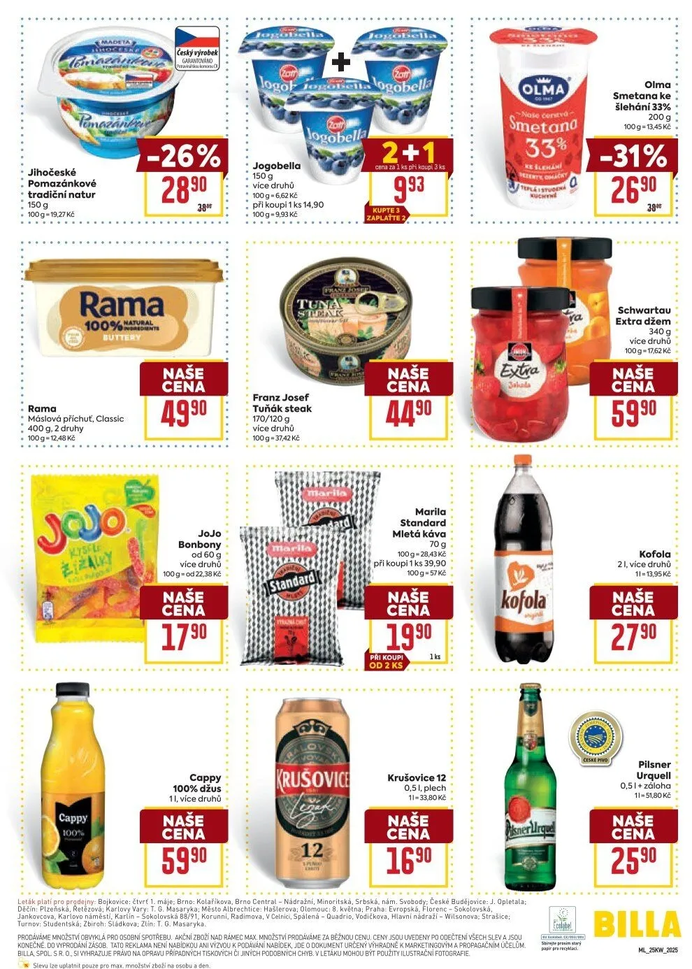 V letáku obchodu BILLA najdete širokou nabídku kvalitních produktů. Mezi nimi jsou jihočeské pomazánkové máslo v tradiční natur variantě o hmotnosti 150 g za 27 Kč. Dále nabízíme jogobellu v různých druzích, kde při koupi 1 ks cena činí 14,90 Kč.