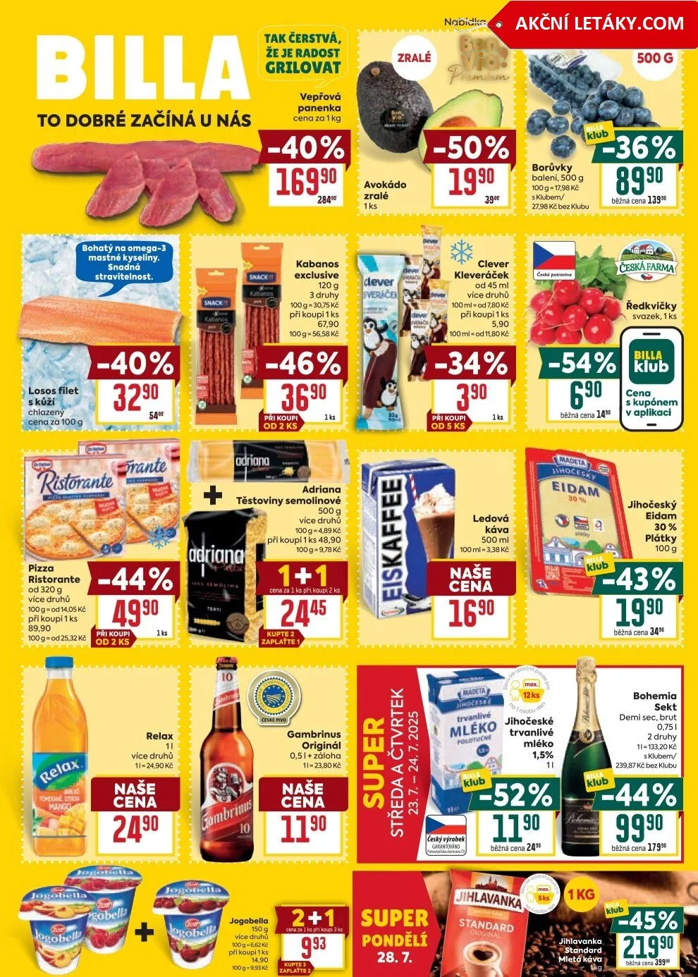 V letáku obchodu BILLA najdete širokou nabídku čerstvých produktů, které potěší každého milovníka grilování. Od středy 23.7. do úterý 29.7.2025 můžete využít skvělé akce na vepřovou panenku s 40% slevou, která je nyní za 169,90 Kč za 1 kg.