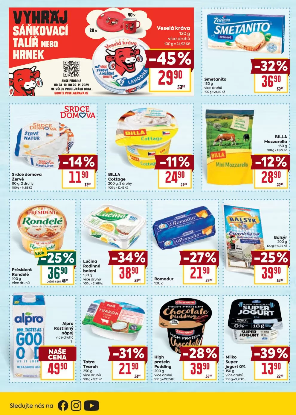 V letáku obchodu BILLA najdete skvělé akce na široký výběr produktů. Například veselá kráva (120 g) je nyní za cenu 24,90 Kč, což představuje slevu 45%. Smetanito (150 g) je k dispozici za 21,30 Kč, se slevou 34%.