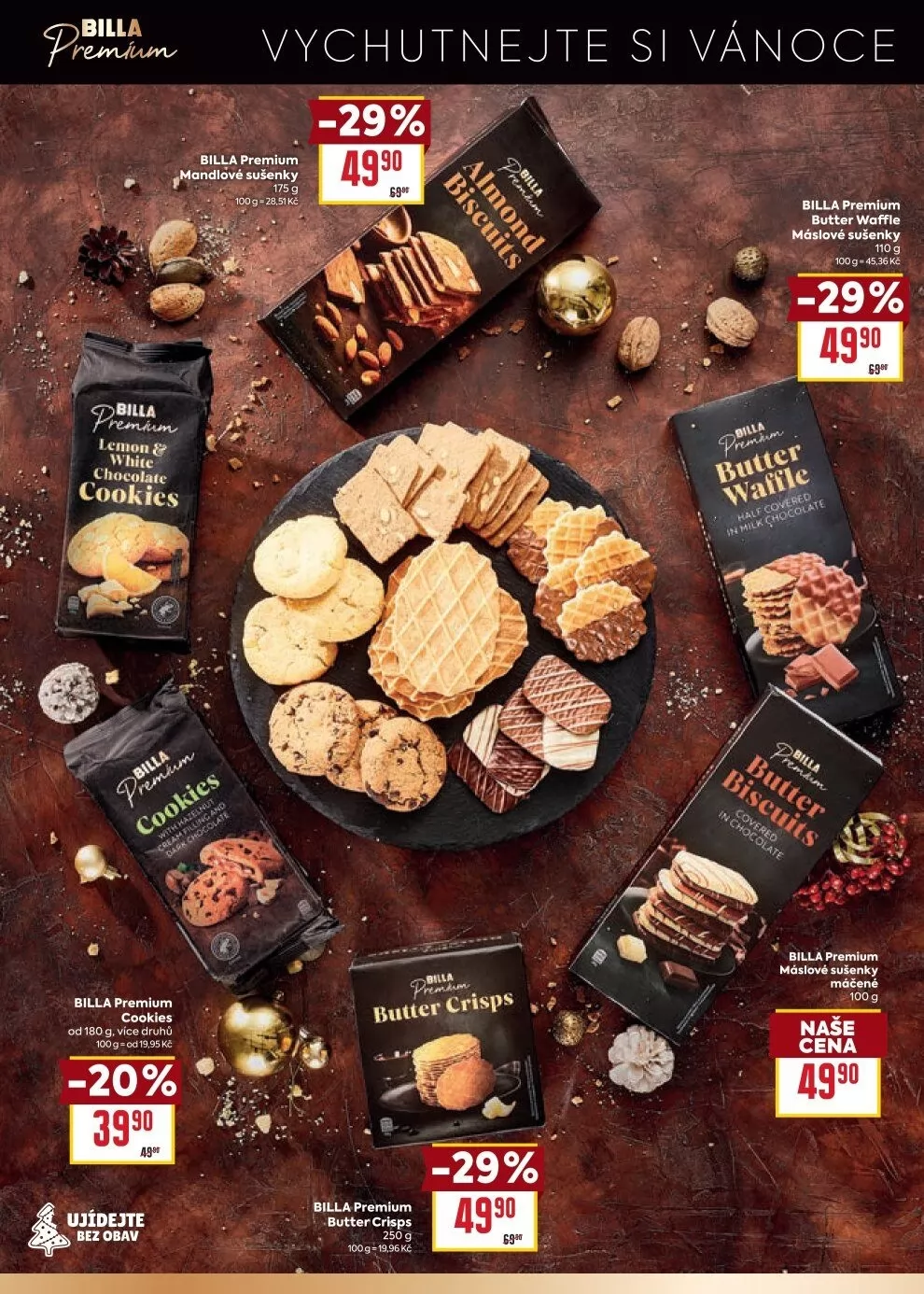 V letáku obchodu BILLA najdete širokou nabídku lahodných produktů. Vychutnejte si BILLA Premium máslové sušenky, které jsou k dispozici v různých variantách. Například sušenky s bílou čokoládou a citronem nebo máslové sušenky máčené. Všechny tyto delikatesy jsou nyní se slevou až 29 %.