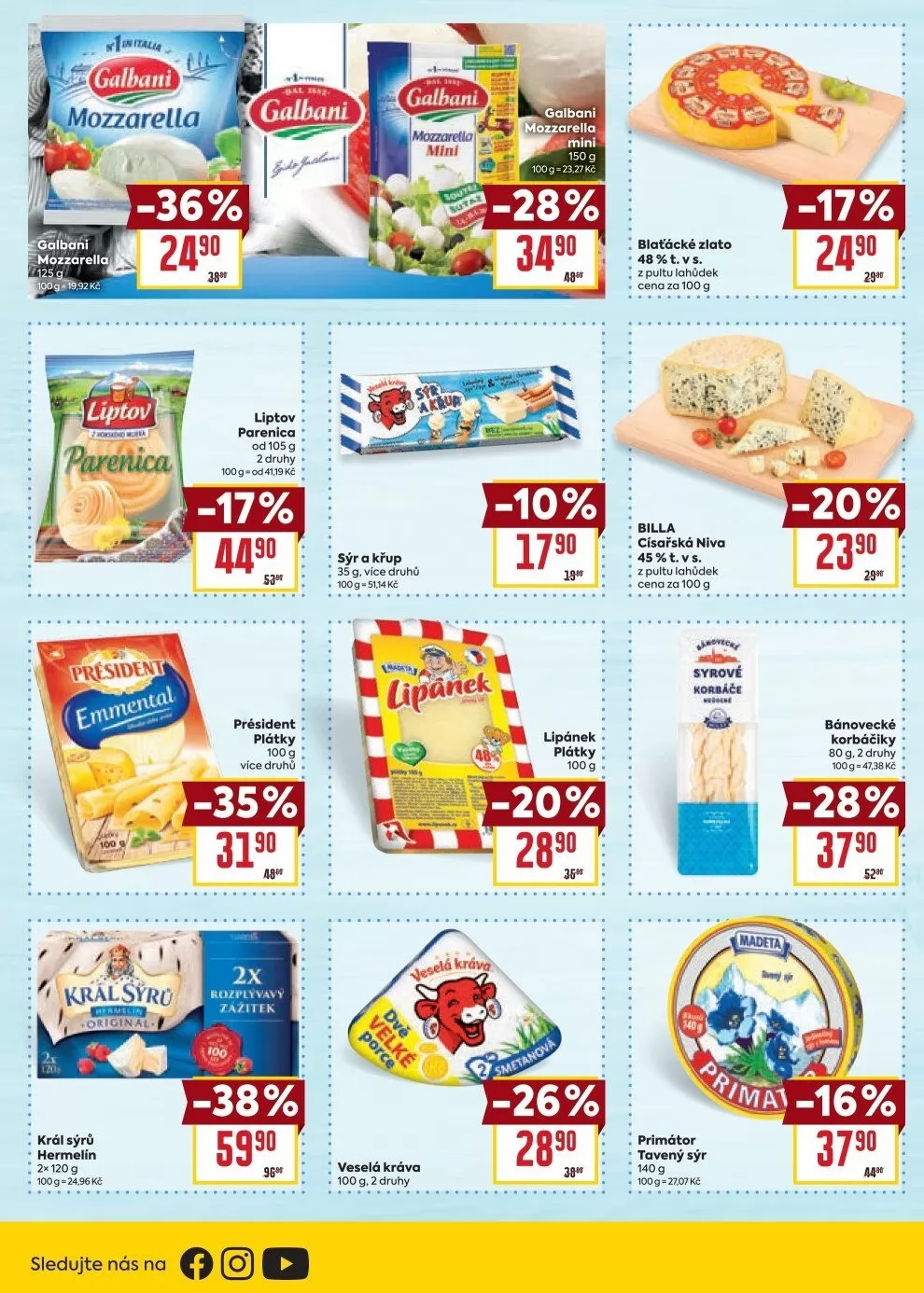 V letáku obchodu BILLA najdete širokou nabídku kvalitních sýrů a mléčných výrobků. Mezi nimi se objevují produkty značky Galbani, jako je mozzarella, která je nyní se slevou -36%. Dále můžete zakoupit parenici od Liptova a král sýrů Hermelín, který je k dispozici v balení po 2x120g.