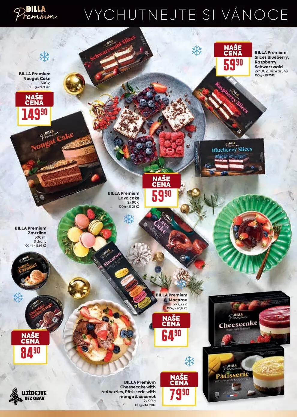 V letáku obchodu BILLA najdete širokou nabídku kvalitních produktů BILLA Premium. Mezi nimi se nachází lahodný nougat cake o hmotnosti 600 g za cenu 149,90 Kč. Dále si můžete vychutnat zmrzlinu BILLA Premium o objemu 500 ml, která je k dispozici ve třech různých příchutích za 84,90 Kč.
