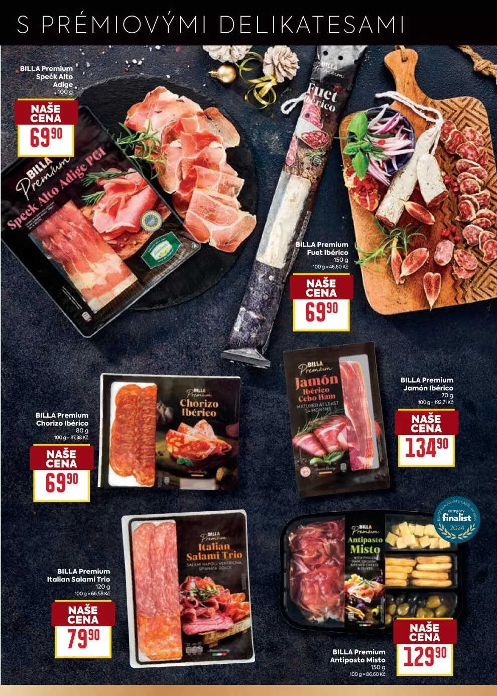 V letáku obchodu BILLA najdete širokou nabídku prémiových delikates. Mezi nimi se nachází BILLA Premium Spečk Altó (100 g) za cenu 69,90 Kč. Dále si můžete vychutnat BILLA Premium Chorizo Ibérico (100 g) za 87,38 Kč a BILLA Premium Italian Salami Trio (120 g) za 79,90 Kč.