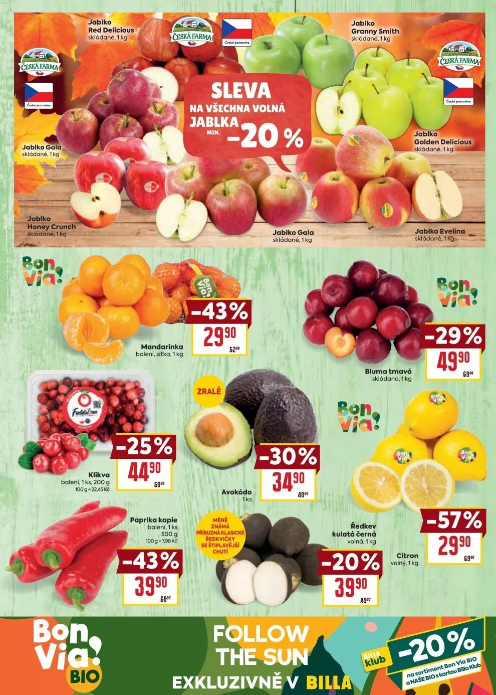 Nezapomeňte na akční nabídky, jako je sleva na všechna volná jablka a výrazné slevy na avokádo a ředkev kulatou černou. V letáku najdete také citrony a papriku kapii. Využijte skvělé ceny a dopřejte si čerstvé a kvalitní potraviny exkluzivně v BILLE!