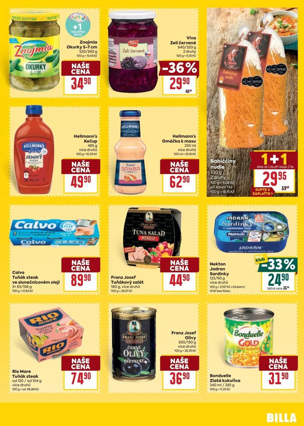 V letáku obchodu BILLA najdete širokou nabídku kvalitních produktů. Mezi nimi jsou čerstvé okurky, jemný tuňák steak ve slunečnicovém oleji od značky Rio Mare, a také červené zelí v různých variantách. Nezapomeňte na oblíbený kečup Hellmann's a omáčku k masu, které jsou k dispozici v několika druzích.