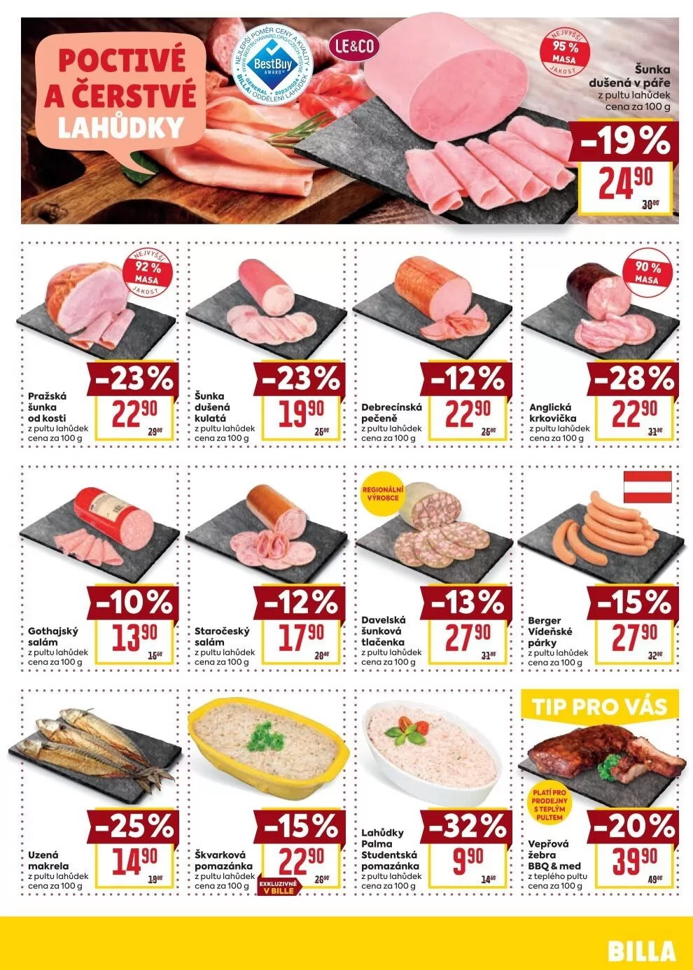 V letáku obchodu BILLA najdete širokou nabídku poctivých a čerstvých produktů. Mezi nimi se objevují lahůdky jako pražská šunka od kosti, gothajský salám, uzená makrela a staročeský škvarková. Všechny produkty jsou z pultu lahůdek a cena za 100 g je uvedena u každého z nich. Nezapomeňte také na šunkovou tlačenku a studentskou pomazánku, které jsou skvělou volbou pro každodenní pohoštění. Pro milovníky masa jsou k dispozici vepřová žebra s BBQ a medem z teplého pultu. Využijte akční ceny a vychutnejte si kvalitní potraviny z BILLA!