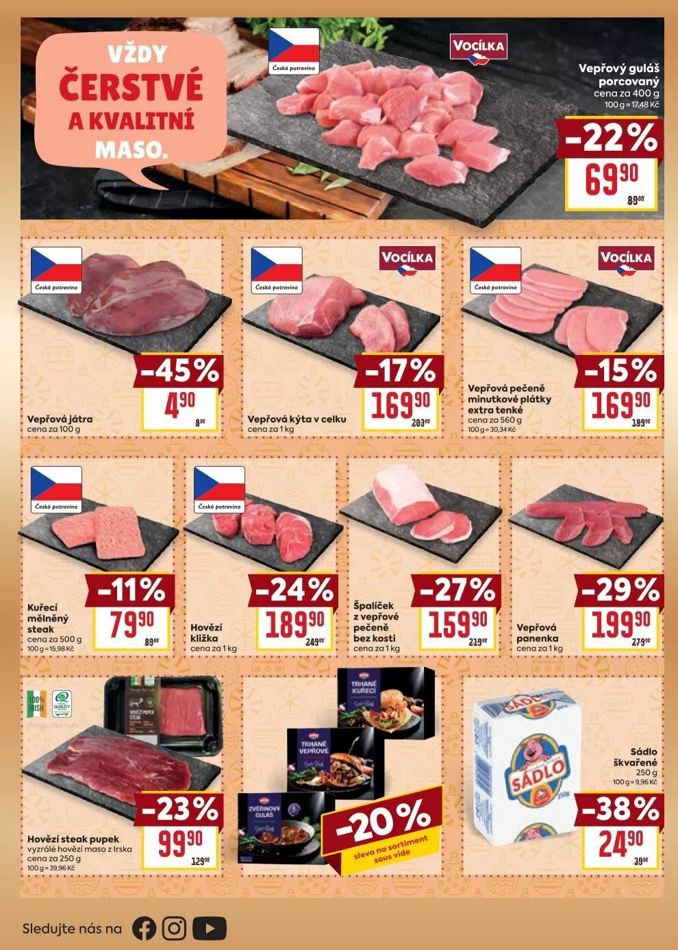 V letáku obchodu BILLA najdete širokou nabídku čerstvých a kvalitních masných produktů. Mezi nimi se vyjímají vepřová játra s 45% slevou, vepřová pečeně a vepřová kýta v celku. Dále nabízíme minutkové plátky kuřecího masa, hovězí kližku a vepřovou panenku, všechny za výhodné ceny. Nezapomeňte také na vepřový guláš a škvařené sádlo, které jsou skvělou volbou pro každodenní vaření. Všechny produkty jsou pečlivě vybrané a připravené pro vaše kulinářské zážitky. Navštivte nás a objevte kvalitní maso za skvělé ceny!