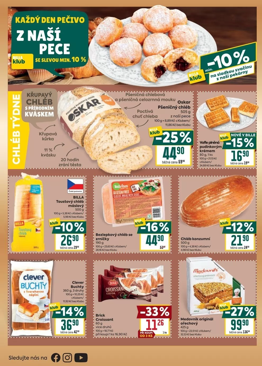 V letáku obchodu BILLA najdete širokou nabídku čerstvého pečiva s atraktivními slevami. Každý den si můžete vychutnat křupavý chléb z naší pece se slevou minimálně 10 %. Nabízíme například máslový toustový chléb o hmotnosti 500 g za 5,98 Kč s klubem.