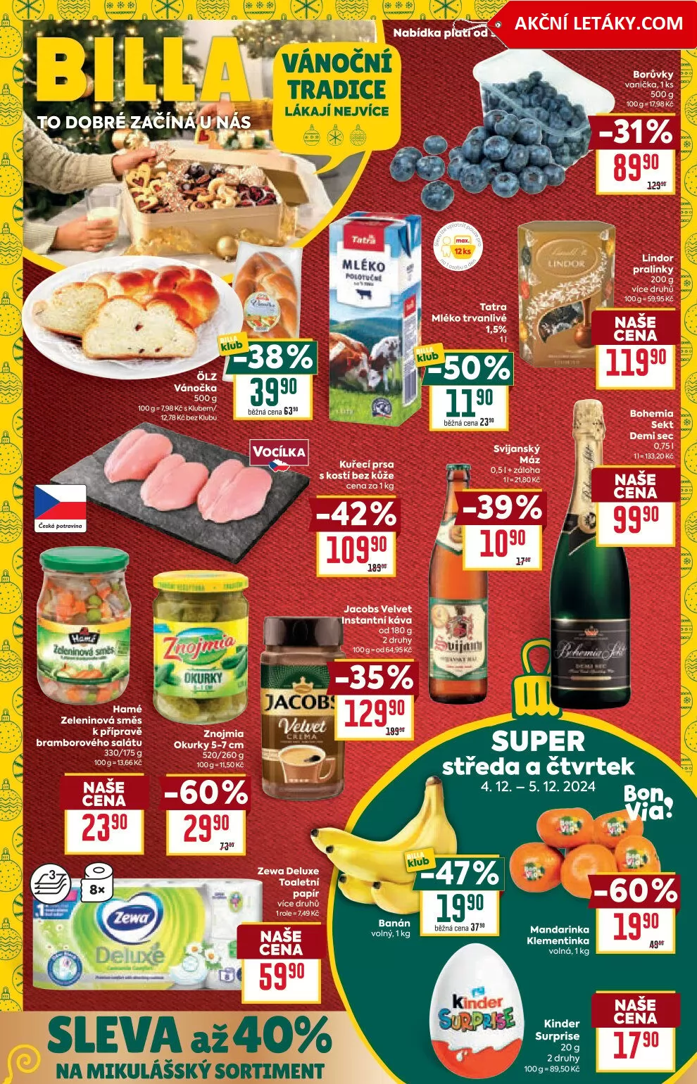 V letáku obchodu BILLA najdete širokou nabídku vánočních produktů, které potěší každého. Od středy 4.12. do úterý 10.12.2024 si můžete zakoupit borůvky, vánočku, trvanlivé mléko 1,5% a lahodné pralinky Lindor. Nezapomeňte na Bohemia sekt demi sec a kuřecí prsa s kostí bez kůže za skvělou cenu.