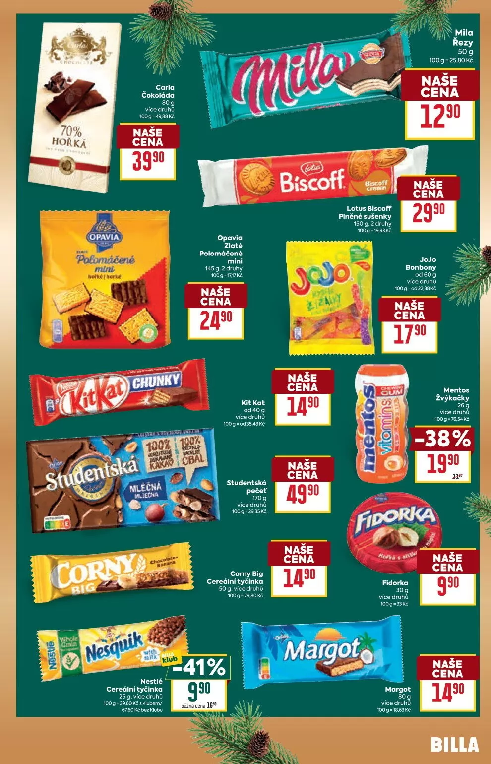 V letáku obchodu BILLA najdete širokou nabídku sladkostí a pochutin. Mezi oblíbené produkty patří čokoláda Carla v různých druzích, která je k dostání v balení 80 g za cenu 39,90 Kč. Dále si můžete vychutnat plněné sušenky Lotus Biscoff, které jsou dostupné v 100 g balení za 19,93 Kč.