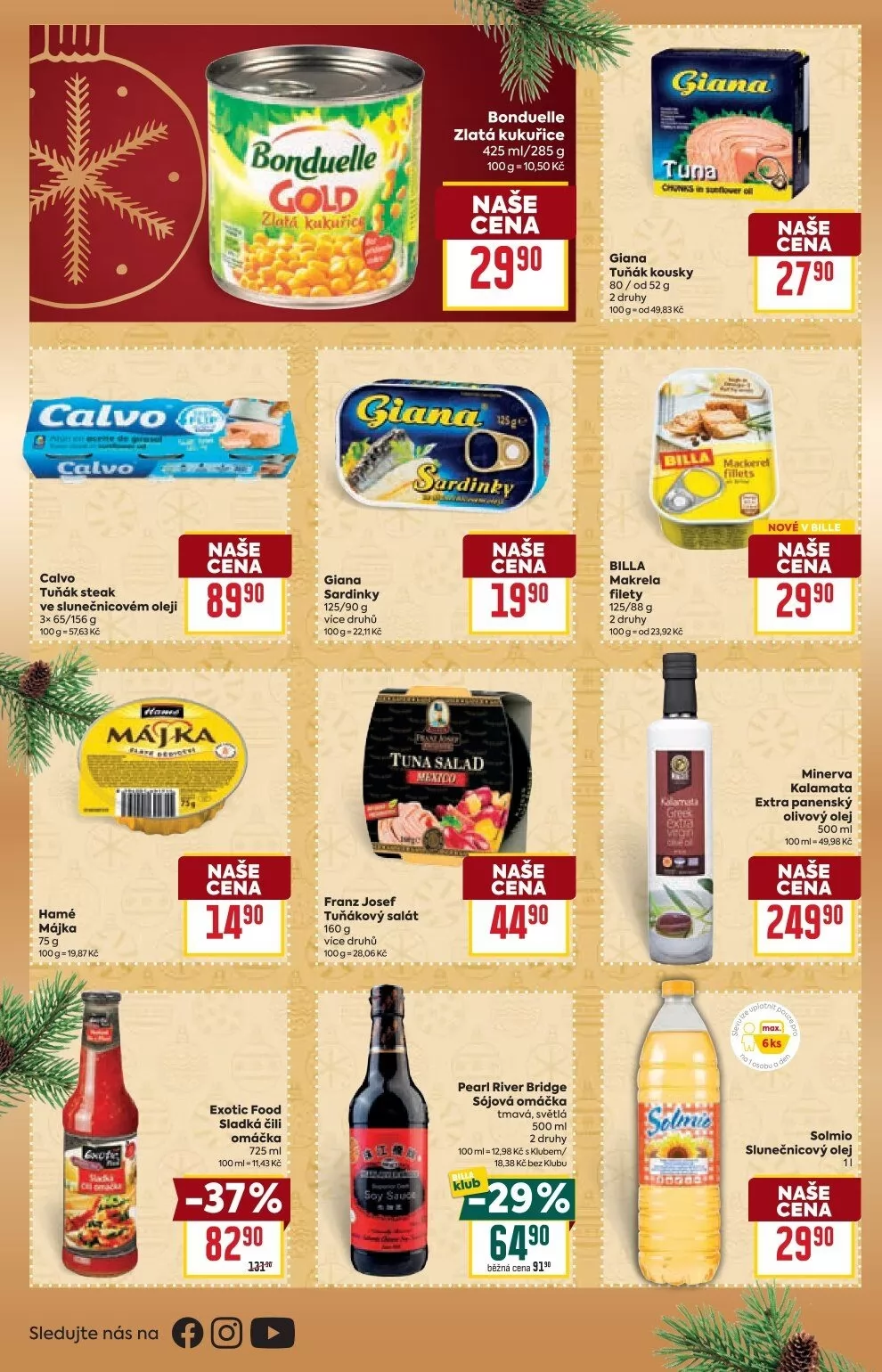 Dalšími lákadly jsou tuňák kousky Giana (80/od 52 g) a makrela filety BILLA (125/88 g), obě za výhodné ceny. Pro milovníky omáček je připravena sladká čili omáčka Exotic Food (725 ml) za 14,30 Kč/100 ml.