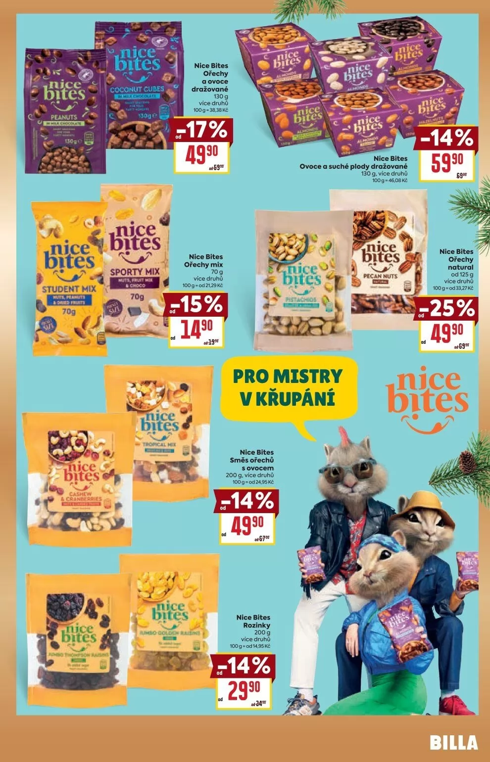 V letáku obchodu BILLA najdete širokou nabídku produktů značky Nice Bites. Mezi nimi jsou různé druhy dražovaných ořechů, které jsou k dispozici v baleních od 70 g do 130 g. Ceny začínají již od 29 Kč. Dále si můžete vybrat z mixu ořechů s ovocem, který je dostupný v balení 200 g. Pro milovníky sušeného ovoce jsou připraveny rozinky v balení 200 g. Všechny produkty jsou k dostání v několika variantách, takže si každý najde to své. Nezapomeňte využít akční ceny a vychutnejte si zdravé mlsání!