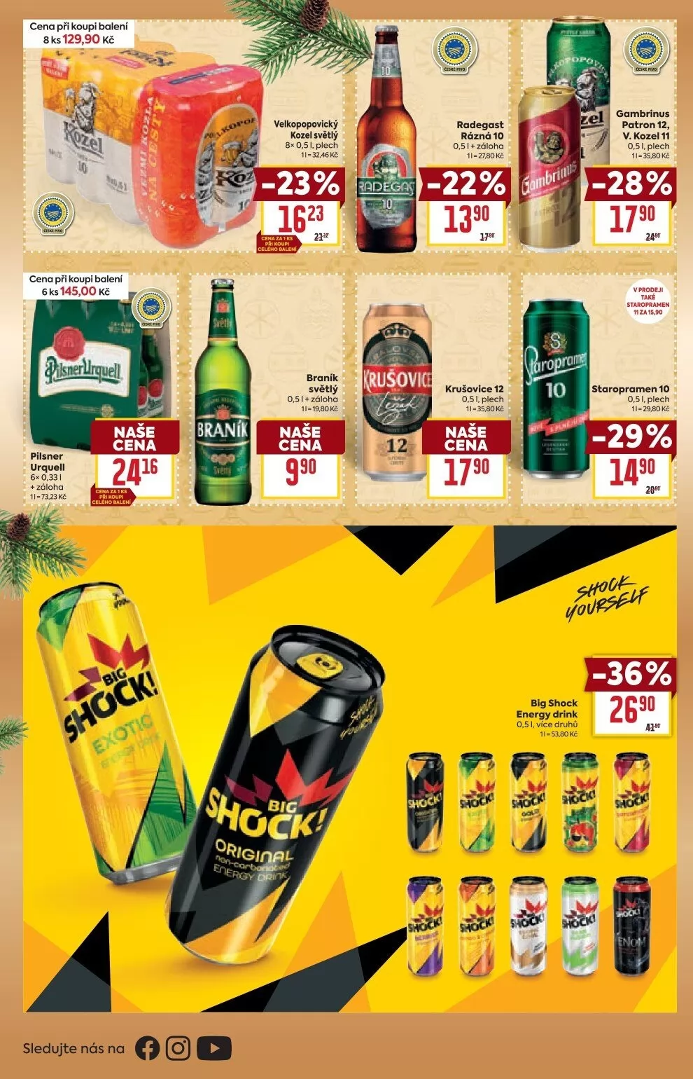 Pro milovníky energetických nápojů je tu Big Shock Energy Drink v různých příchutích. A pokud máte rádi Pilsner Urquell, ten je k dispozici za 24,16 Kč.