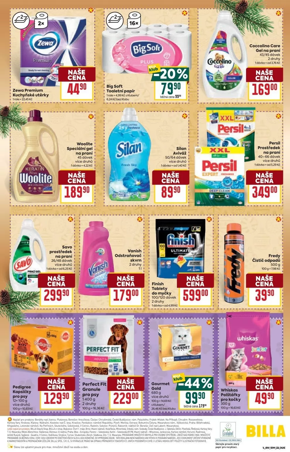 V letáku obchodu BILLA najdete širokou nabídku kvalitních produktů za skvělé ceny. Mezi nimi jsou kuchyňské utěrky Zewa Premium za 44,90 Kč, speciální gel na praní Woolite za 189,90 Kč a toaletní papír Big Soft. Aviváž Silan je k dispozici za 79,90 Kč a odstraňovač skvrn Vanish za 179,00 Kč.