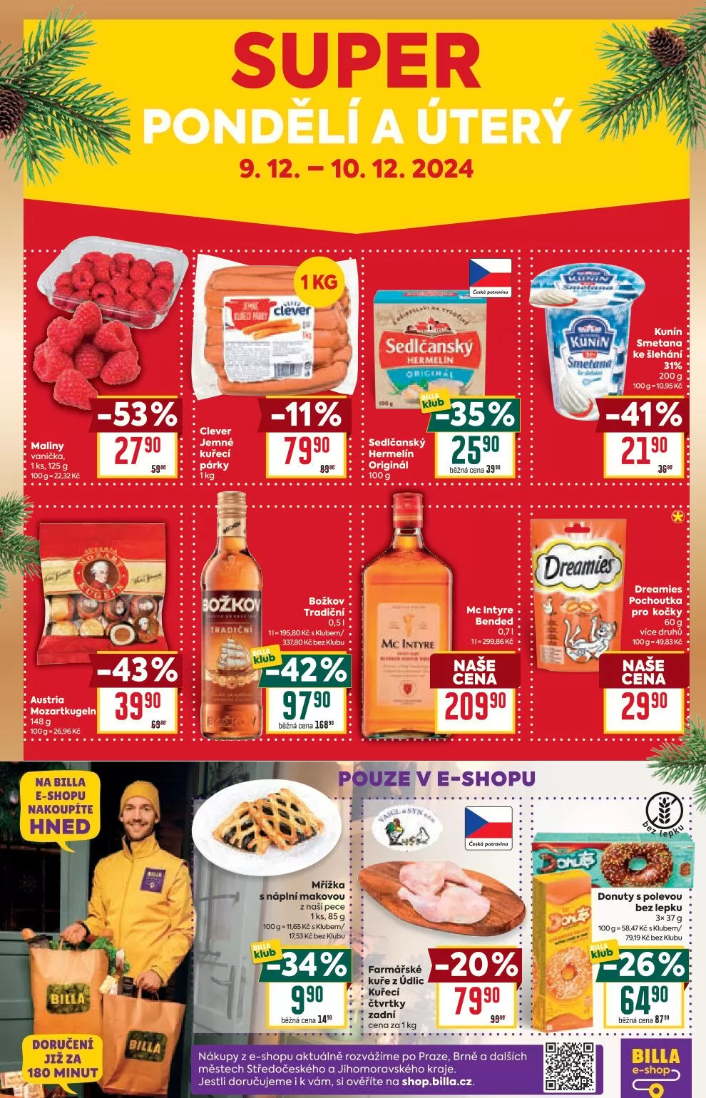 V letáku obchodu BILLA na období 9.12. - 10.12. 2024 najdete širokou nabídku produktů za skvělé ceny. Například Sedlčanský hermelín je nyní k dostání se slevou -42%. Pro milovníky sladkostí jsou připraveny rakouské Mozartkugeln v balení 148 g. Pokud hledáte něco na rychlé občerstvení, vyzkoušejte jemné kuřecí párky Clever, které jsou také v akci.