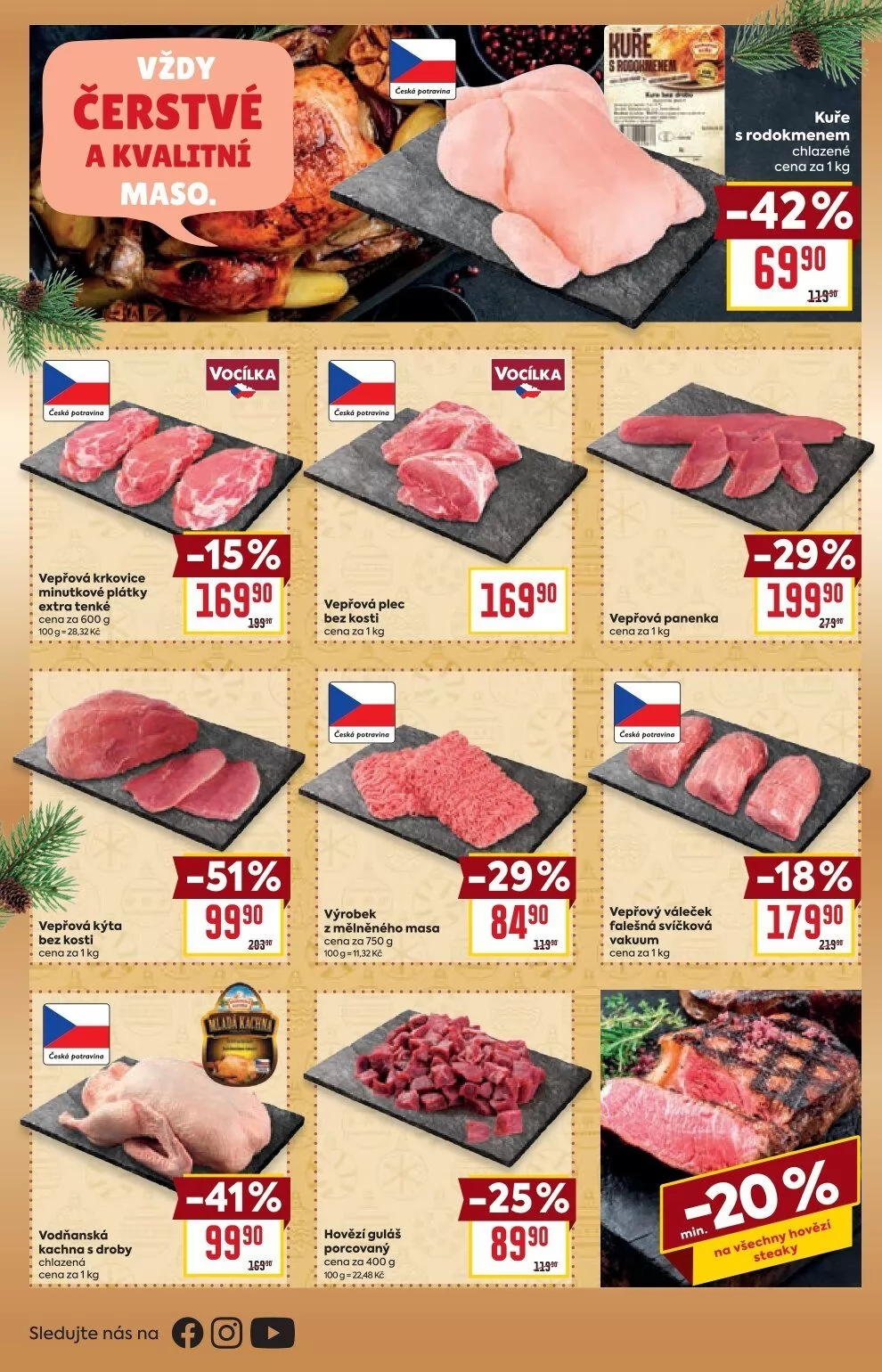 Pro milovníky hovězího masa máme hovězí guláš porcovaný a vepřovou panenku. Nezapomeňte také na vepřový váleček, falešnou svíčkovou a chlazené kuře s rodokmenem. Všechny produkty jsou k dispozici za výhodné ceny. Navštivte nás a objevte skvělé akce!