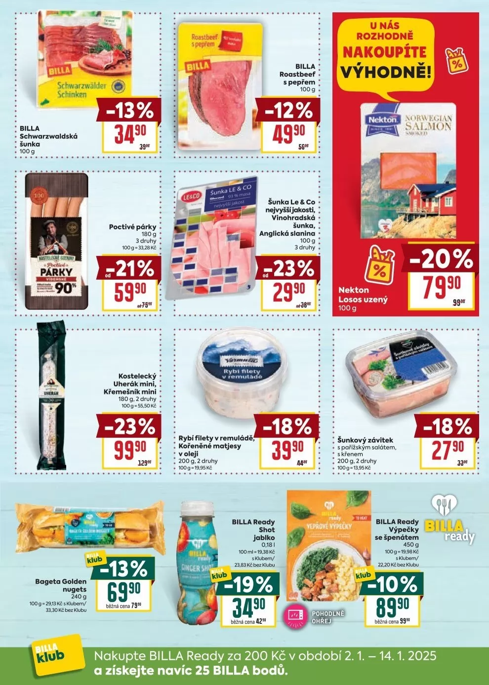 V nabídce nechybí ani uzený losos a praktické BILLA ready produkty, jako jsou výpečky se špenátem nebo jablečný nápoj. Při nákupu nad 200 Kč v období do 14. 1. 2025 můžete získat navíc 25 BILLA bodů. Nakupujte výhodně a užijte si skvělé chutě!