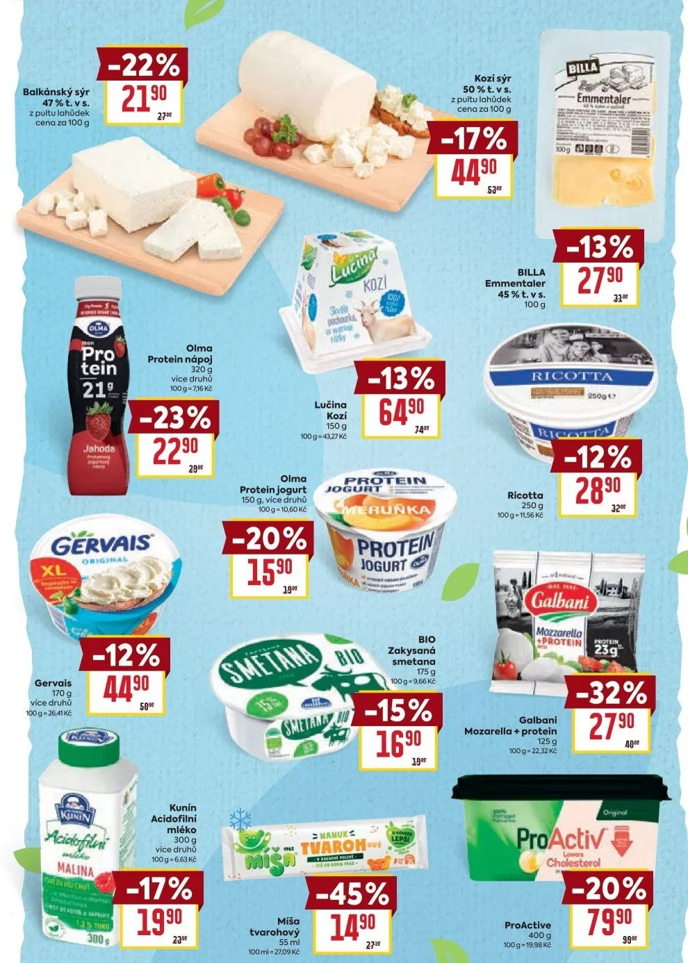 Pro milovníky kozího sýra je v nabídce Lucina kozí 150 g za 27 Kč za 100 g. Nezapomeňte také na proteinové jogurty Olma, které jsou k dostání v různých variantách, a jejich cena je 10,60 Kč za 100 g se slevou -20%.
