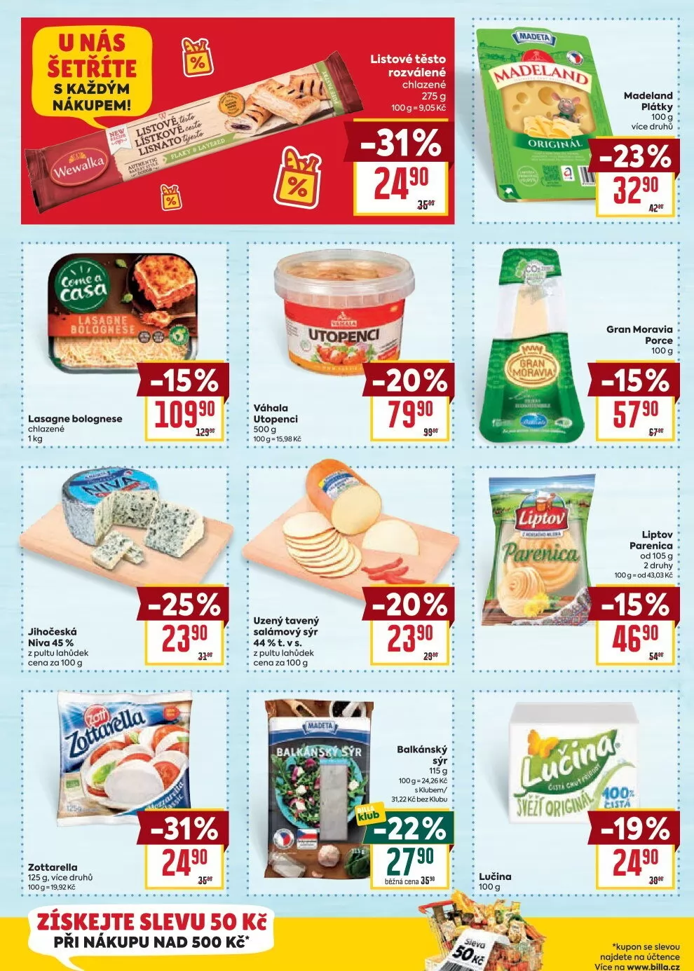V letáku BILLA najdete skvělé nabídky, jako jsou chlazené lasagne Bolognese za 239 Kč/kg a jihočeská niva 45% z pultu lahůdek za 249 Kč/100 g.