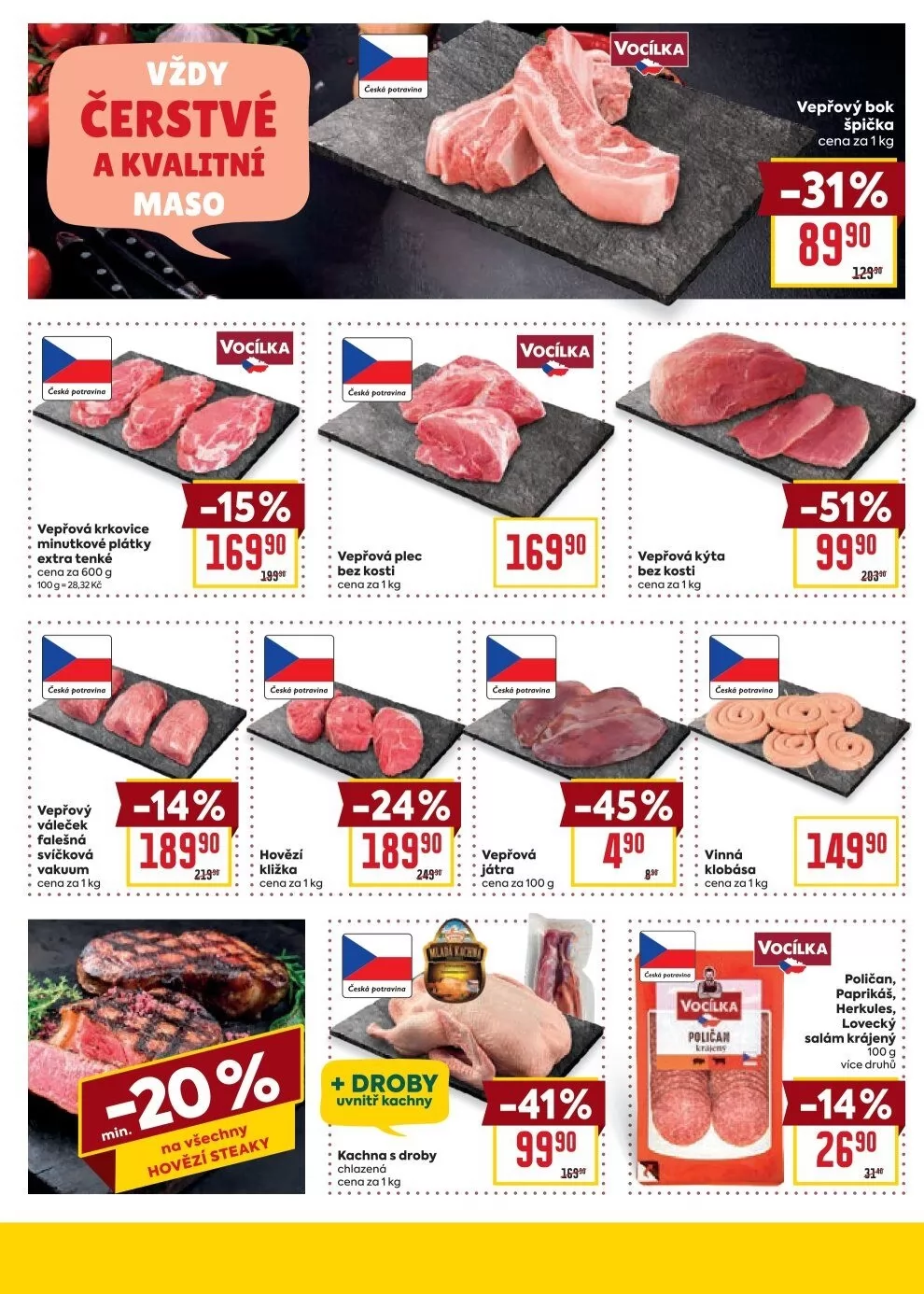 V letáku obchodu BILLA najdete širokou nabídku čerstvého a kvalitního masa. Mezi hlavními produkty se objevují vepřová krkovice v minutkových plátcích za cenu 169,90 Kč za 600 g, a vepřová kýta bez kosti, která je cenově výhodná za 99,90 Kč za 1 kg.