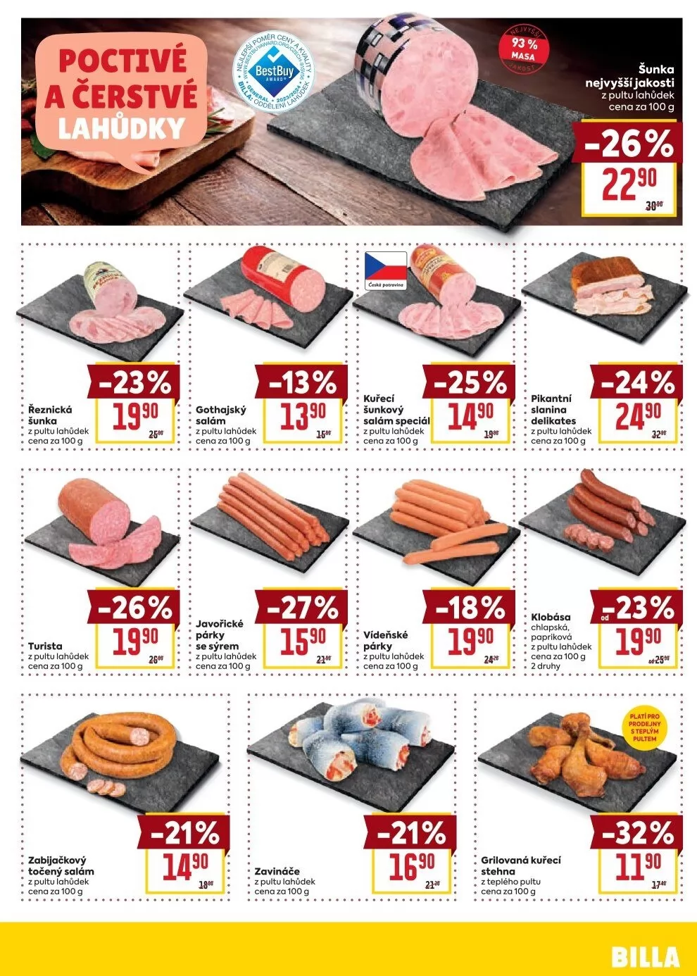 V letáku obchodu BILLA najdete širokou nabídku kvalitních produktů z pultu lahůdek. Mezi nimi se nachází poctivá šunka nejvyšší jakosti, která je k dispozici za cenu 1990 Kč za 100 g, s atraktivní slevou -26%. Dále si můžete vybrat z řeznické šunky, gothajského salámu a kuřecího šunkového salámu speciál, všechny s cenou kolem 1390 Kč za 100 g.