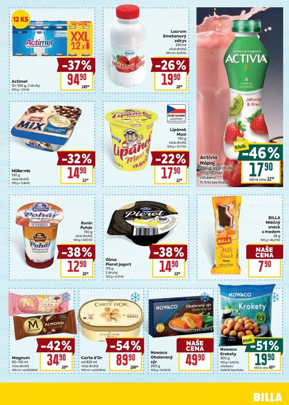 V letáku obchodu BILLA najdete širokou nabídku produktů za skvělé ceny. Mezi nimi jsou například jogurty Actimel v balení 12x100 g, které jsou k dispozici ve dvou druzích. Dále si můžete vybrat smetanový zákys Lacrum o objemu 330 ml nebo český výrobek Lipdnek maxi 130 g.