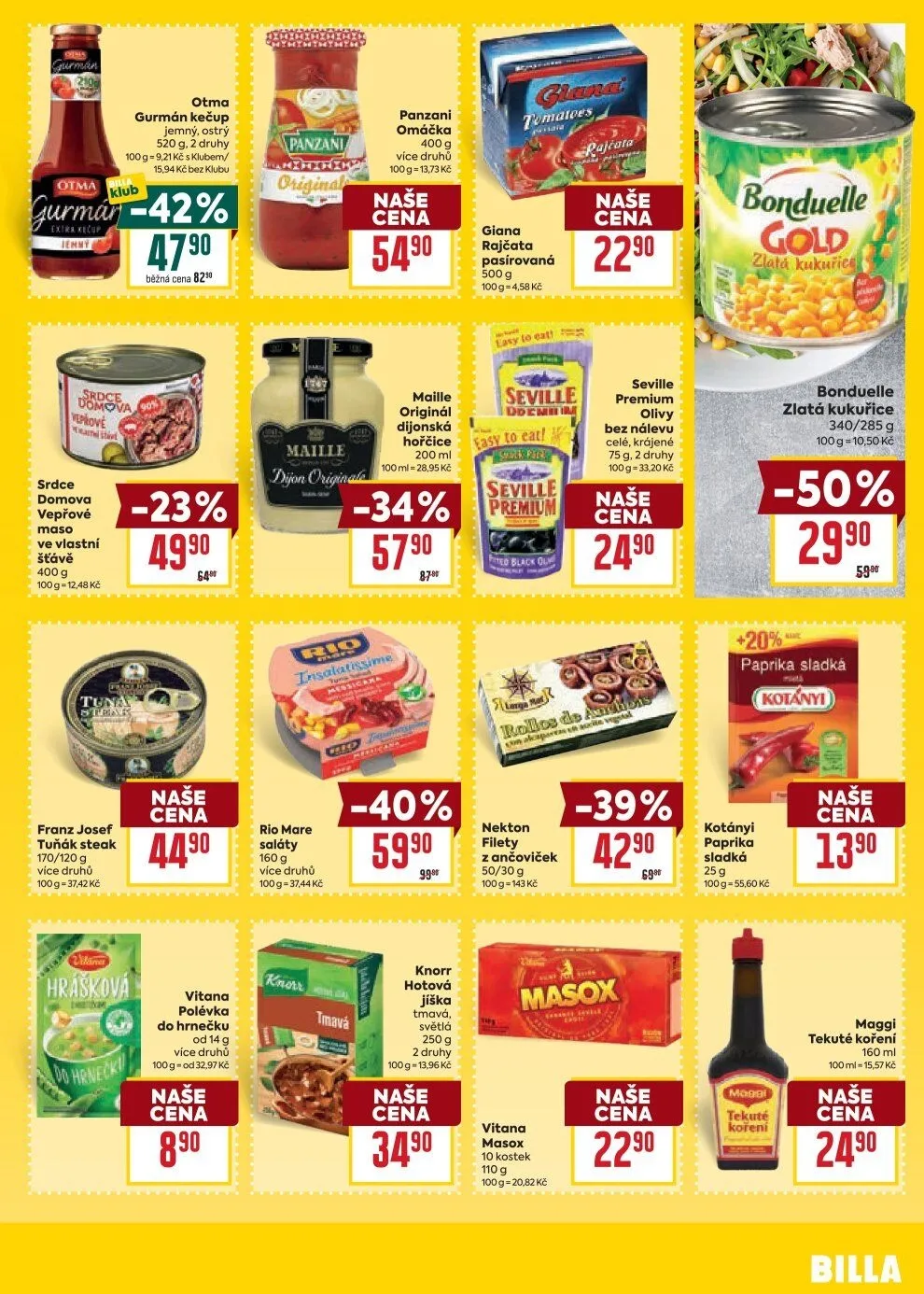 V letáku obchodu BILLA najdete širokou nabídku kvalitních produktů za skvělé ceny. Mezi nimi se nachází gurmánský kečup Otma, který je k dispozici ve dvou variantách – jemný a ostrý, v balení 520 g. Dále nabízíme vepřové maso ve vlastní šťávě o hmotnosti 400 g, ideální pro rychlou přípravu chutného jídla.