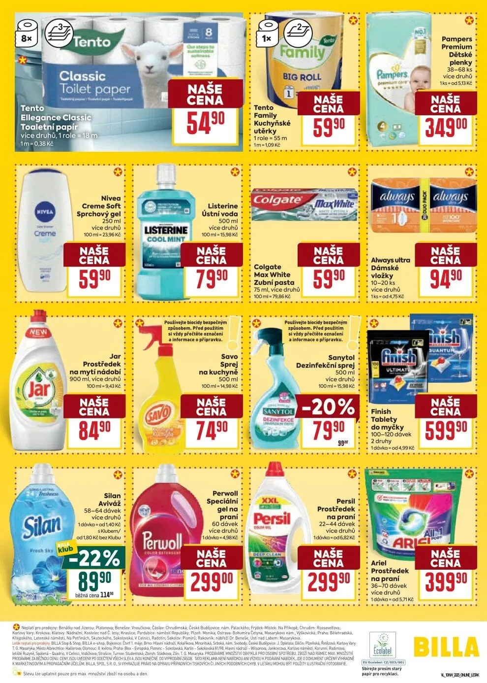 V letáku obchodu BILLA najdete širokou nabídku produktů pro každodenní potřebu. Mezi nimi se nachází toaletní papír Tento Classic, který nabízí 18 metrů na jedné roli za skvělou cenu 0,38 Kč za metr. Dále si můžete vybrat sprchový gel Nivea Creme Soft v objemu 250 ml.