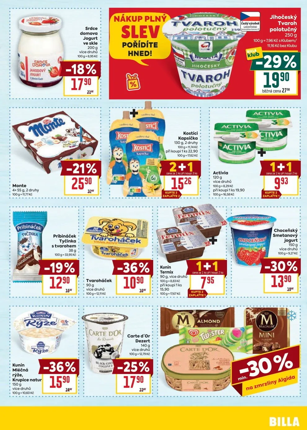 V letáku obchodu BILLA najdete širokou nabídku kvalitních českých výrobků. Mezi nimi se objevují jogurty ve skle o hmotnosti 200 g, které jsou k dispozici v několika druzích a nyní za zvýhodněnou cenu 25,90 Kč. Dále si můžete pořídit Pribináček tyčinku s tvarohem (38 g) za 33,95 Kč.