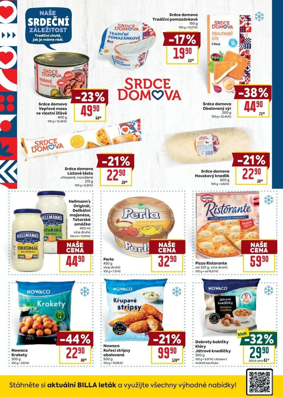 V letáku obchodu BILLA najdete širokou nabídku produktů, které potěší vaše chuťové pohárky. Mezi tradičními chutěmi se objevuje vepřové maso ve vlastní šťávě (400 g) a oblíbené pomazánkové máslo (100 g). Nechybí ani obalovaný sýr (200 g) a houskový knedlík (600 g), které jsou ideální pro přípravu domácích pokrmů.