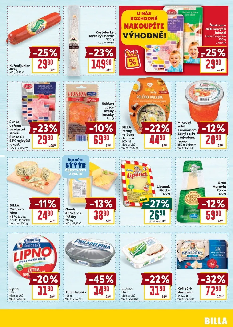 V letáku obchodu BILLA najdete širokou nabídku kvalitních produktů za výhodné ceny. Mezi nimi se objevují lahůdky jako lovecký uherák od Kosteleckého, který je nyní za skvělou cenu 429 Kč za 100 g. Dále nabízíme kuřecí junior v balení 400 g za 299 Kč, ideální pro rodinné vaření.