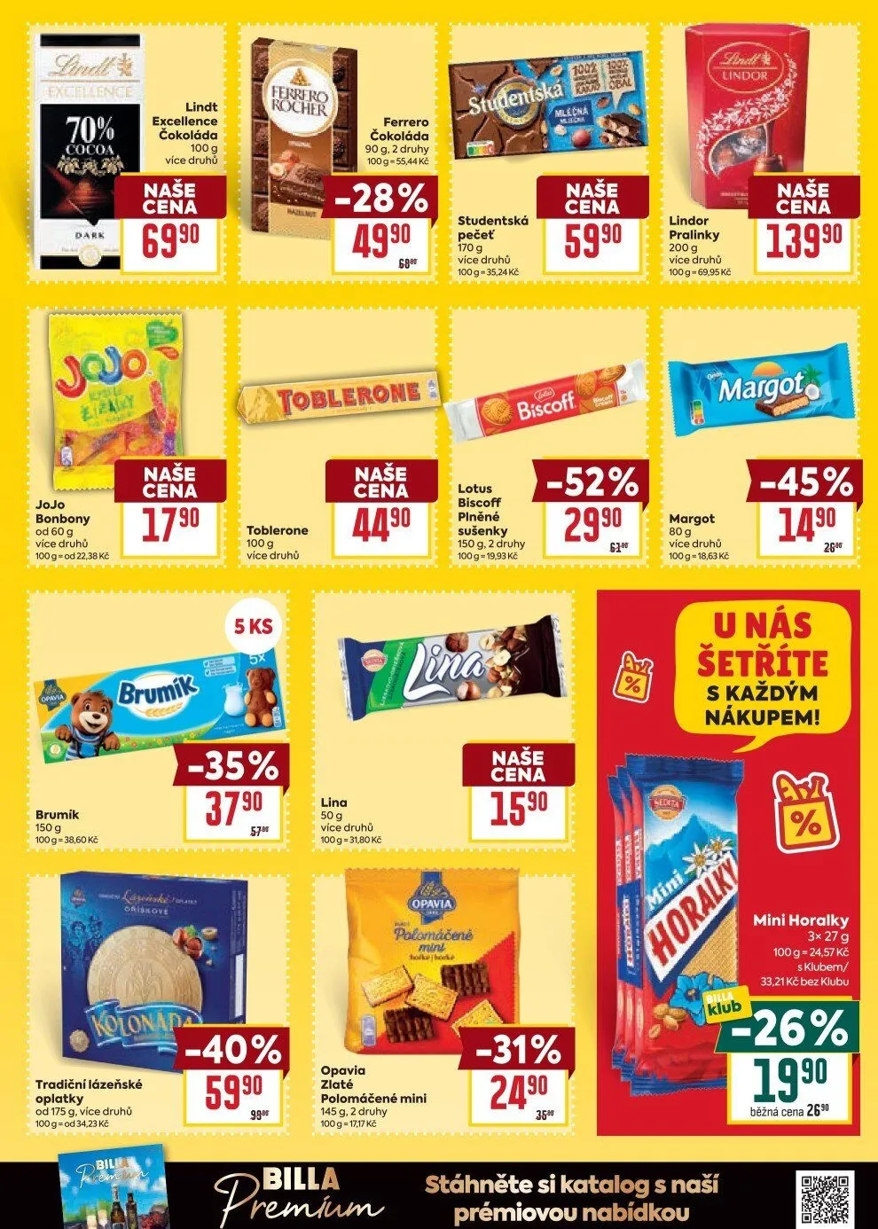 V letáku obchodu BILLA najdete širokou nabídku sladkostí a pochutin. Mezi oblíbené produkty patří bonbony různých druhů, čokolády Excellence a Toblerone, které jsou k dispozici v několika variantách. Nezapomeňte také na pralinky Lindor a sušenky Biscoff, které potěší každého milovníka sladkého.