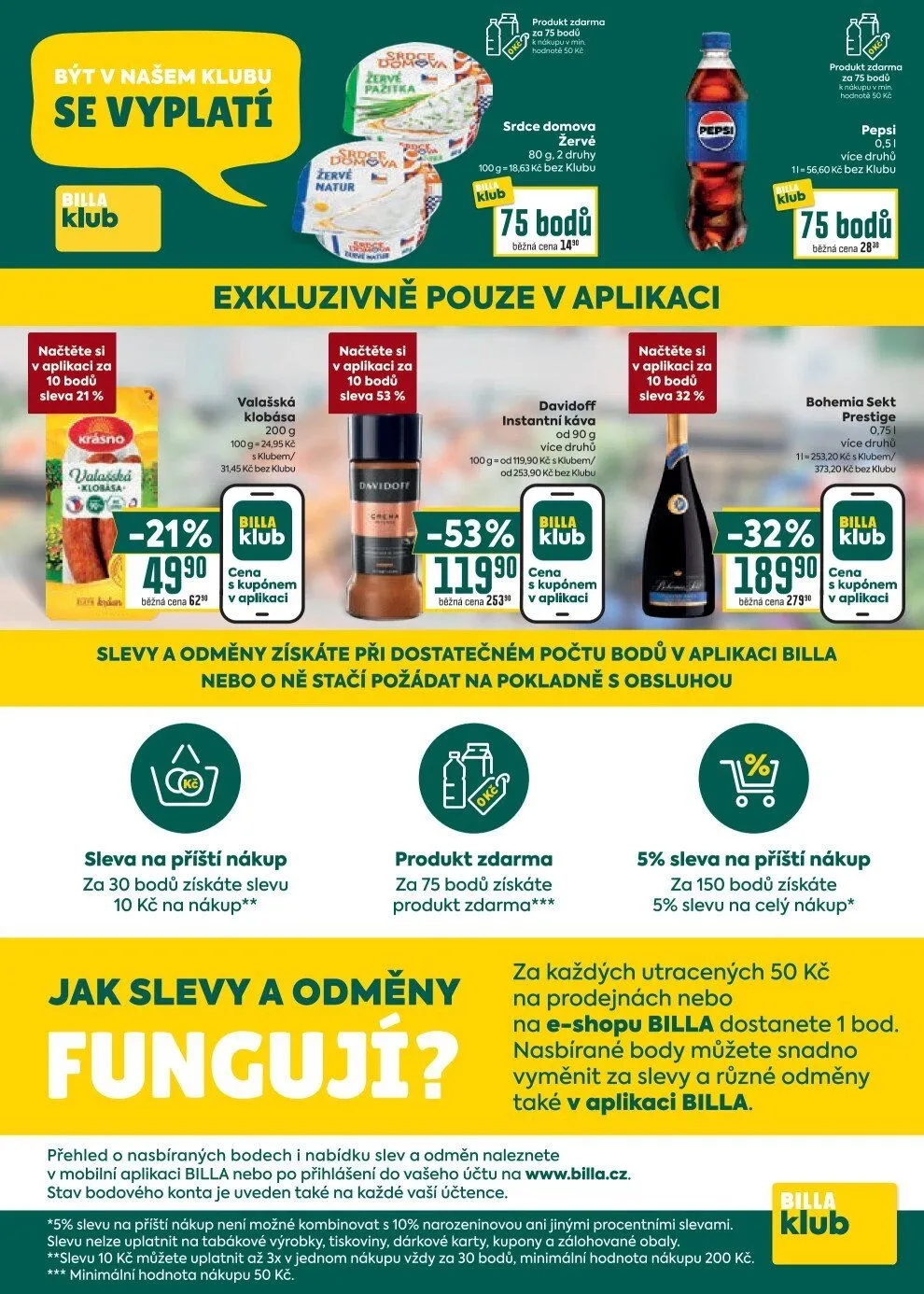 V obchodě BILLA se vyplatí být členem klubu! Získejte exkluzivní slevy a odměny za nasbírané body. Například, za 75 bodů můžete získat produkt zdarma. Mezi nabízenými produkty najdete žervé v 80 g balení, valašskou klobásu 200 g a instantní kávu Davidoff od 90 g. Sleva až 53 % na vybrané produkty je dostupná pouze v aplikaci. Nezapomeňte, že za každých utracených 50 Kč získáte 1 bod, který můžete vyměnit za slevy a další výhody. Přehled o nasbíraných bodech a nabídku slev naleznete v mobilní aplikaci BILLA nebo na webu. Využijte skvělé nabídky a ušetřete při každém nákupu!